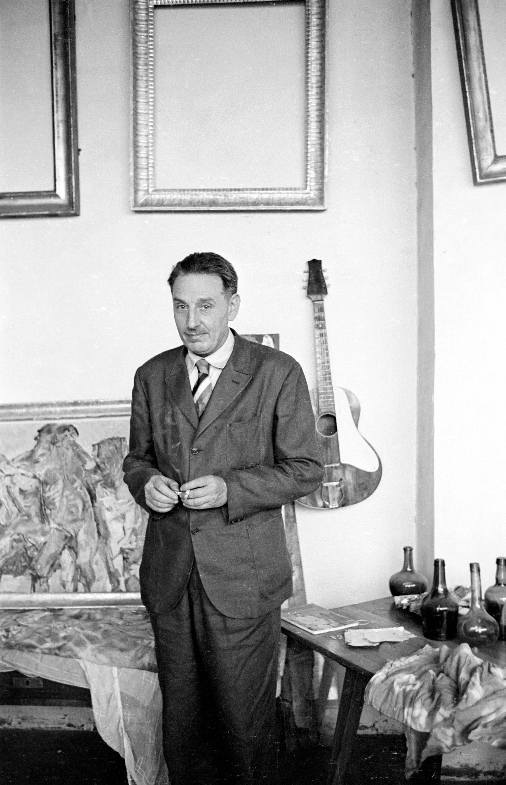 Black and white photograph of a man in a suit standing in an artist's studio, with a painted canvas, acoustic guitar, and glass bottles visible behind him