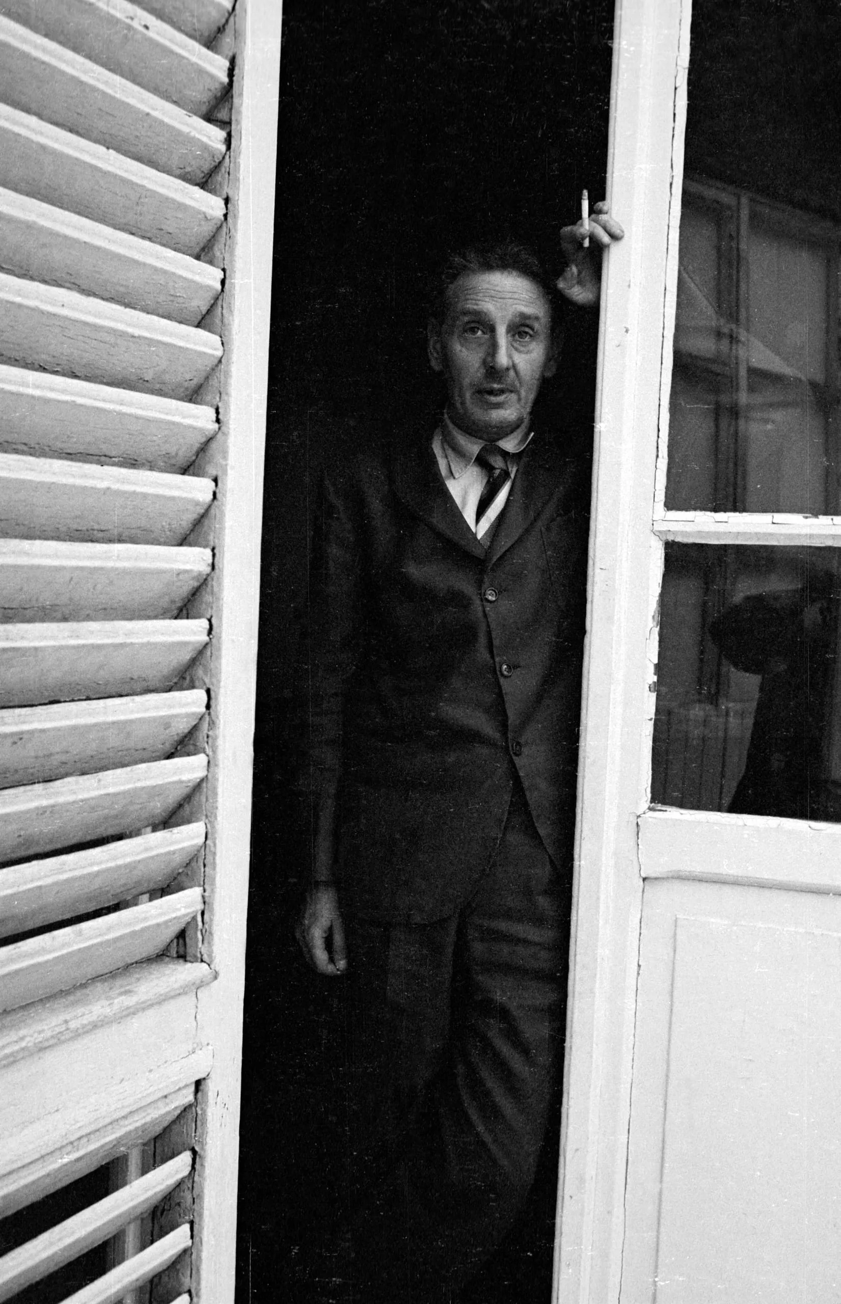 Black and white photograph of a white man in a dark suit standing in a narrow doorway, head tilted up, holding a cigarette, flanked by white louvered shutters