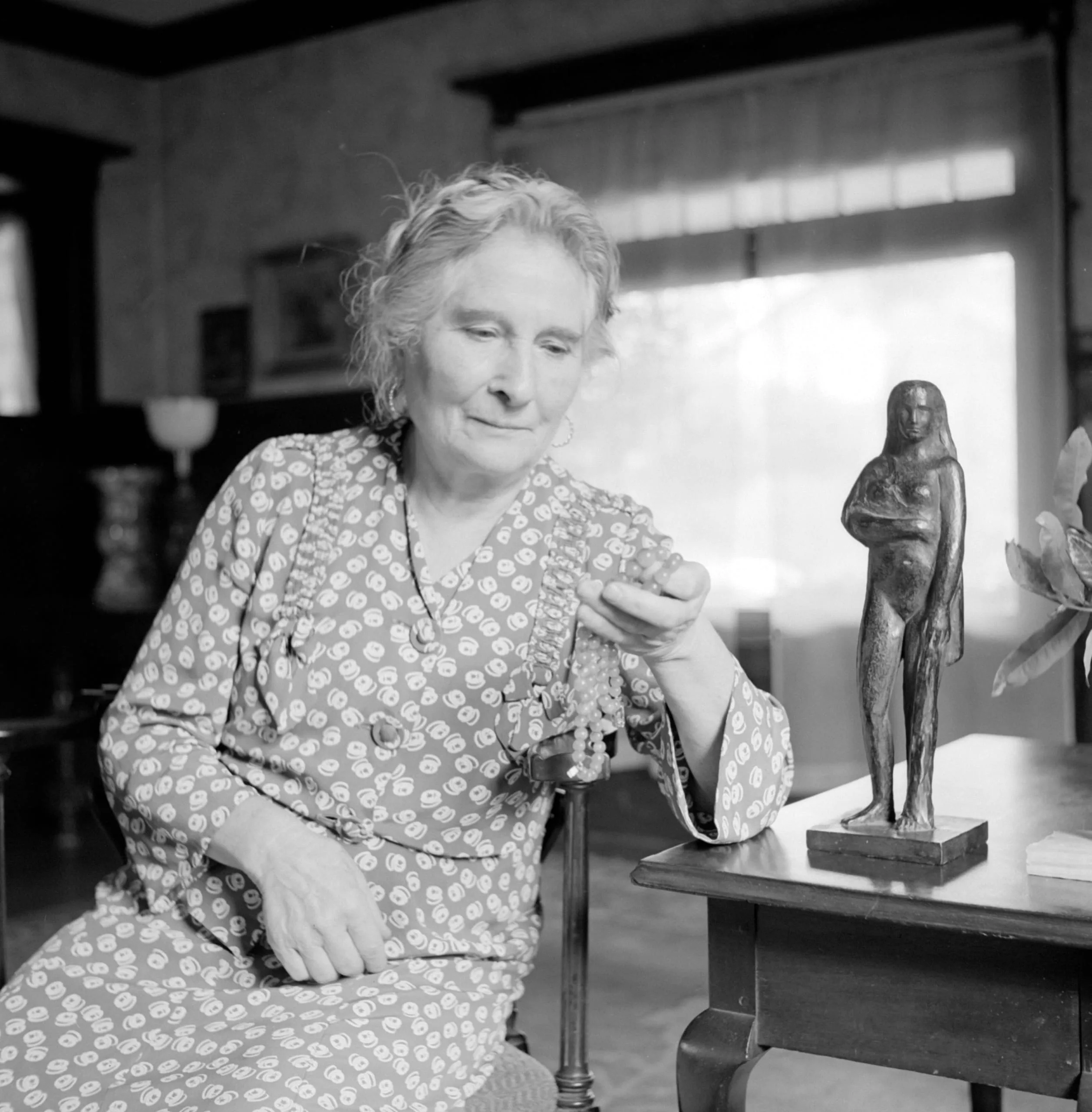 Black and white photograph of an older white woman seated indoors, examining a small object in her raised hand, with a dark figurative sculpture on a table beside her