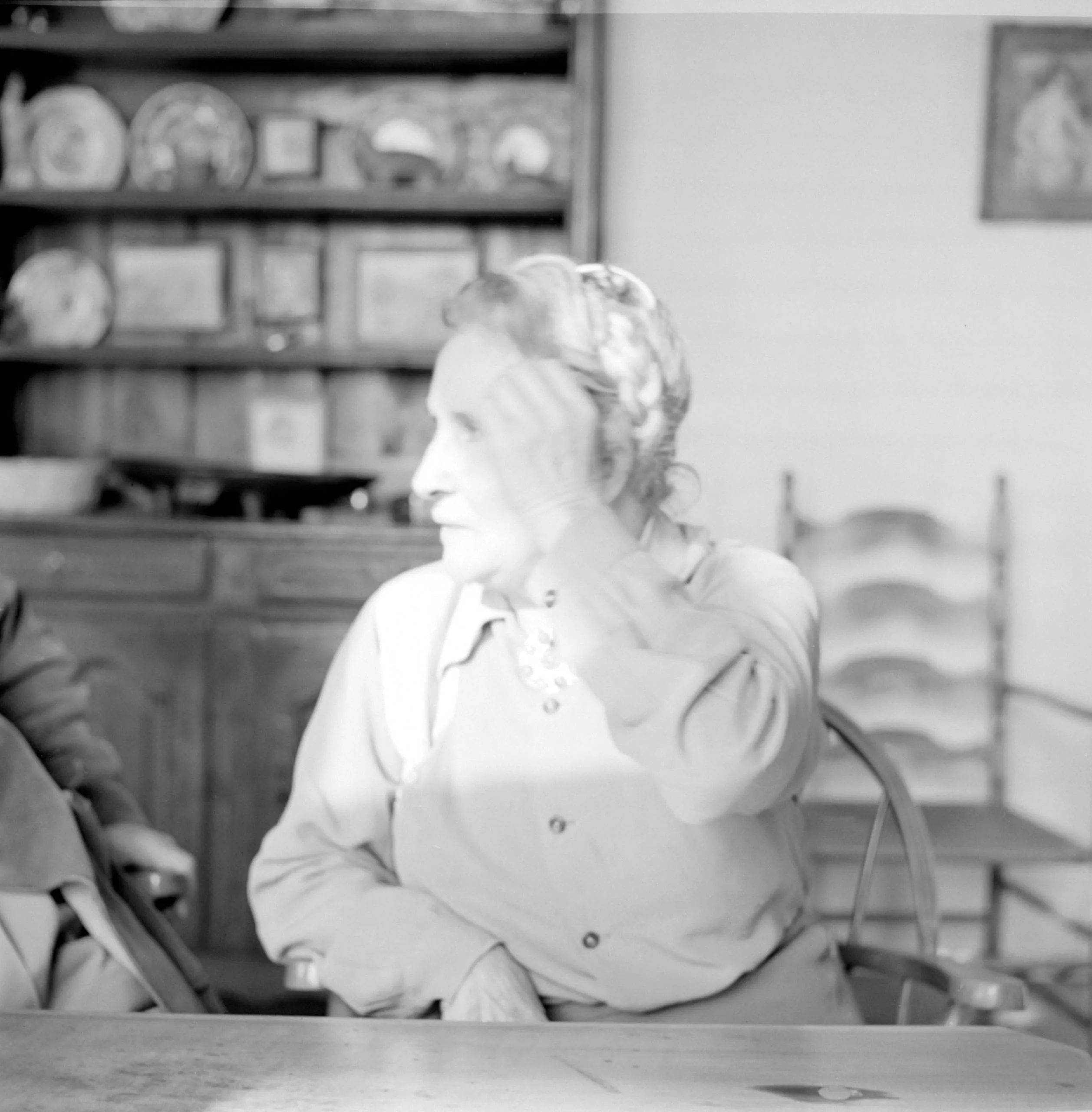 Black and white photograph of a white woman with light hair seated at a table, shown from the waist up in soft profile, turned to look left, with a hutch of dishes out of focus behind her
