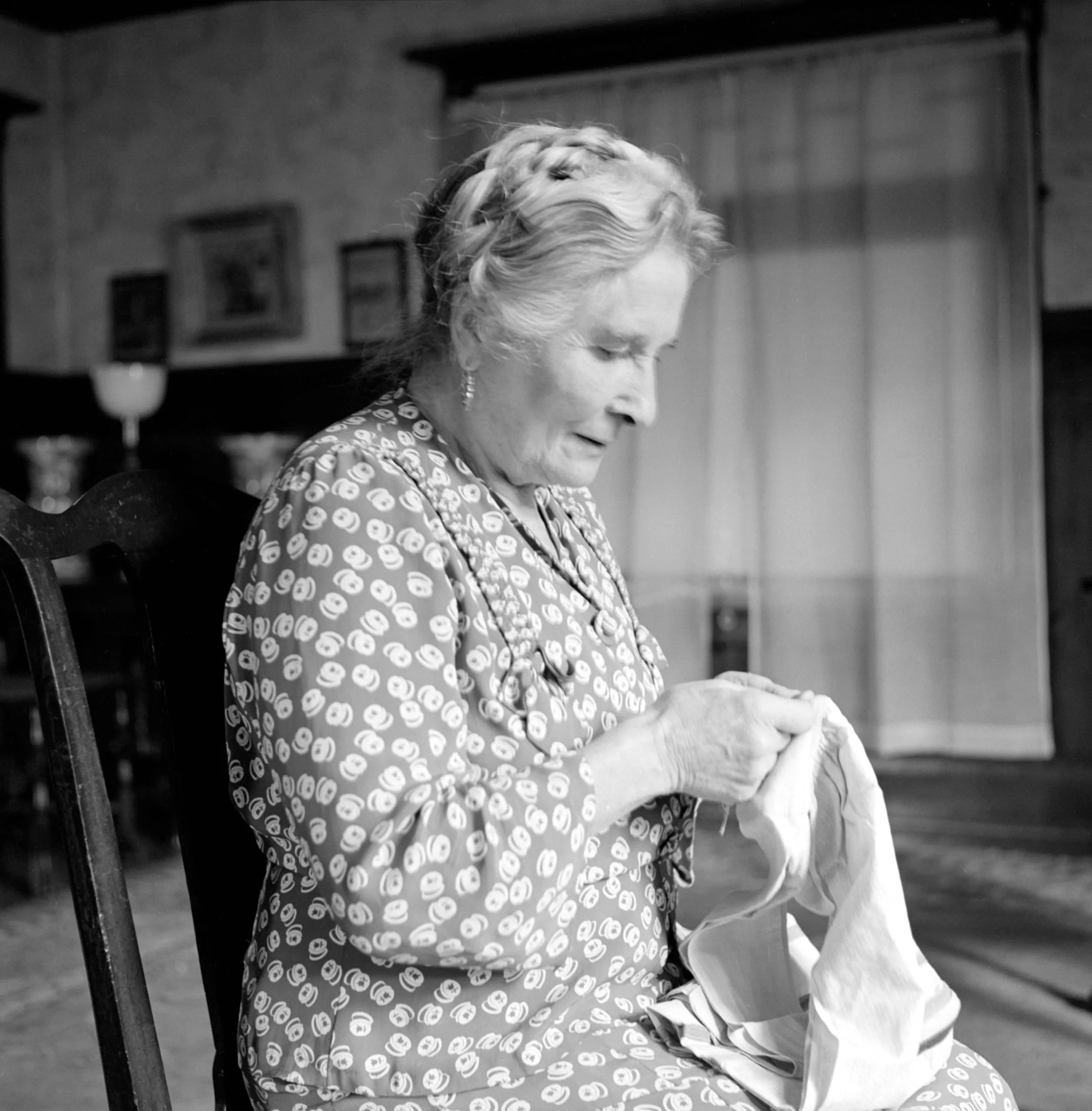 Black and white photograph of an older woman seated in a wooden chair, head bowed over pale fabric she works with both hands, wearing a patterned dress