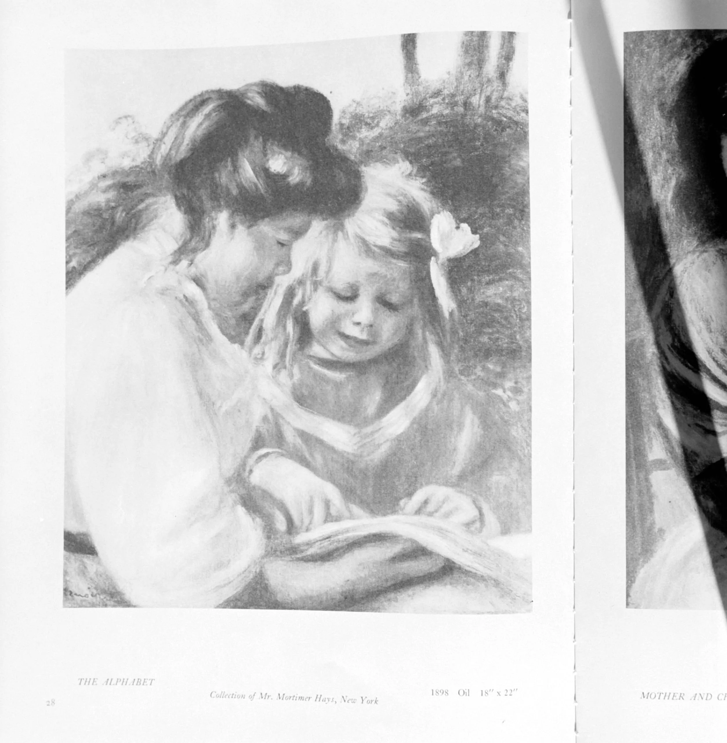 Black-and-white print reproducing an oil painting of a woman and young girl with bowed heads sharing an open book, soft tonal gradations, 1898