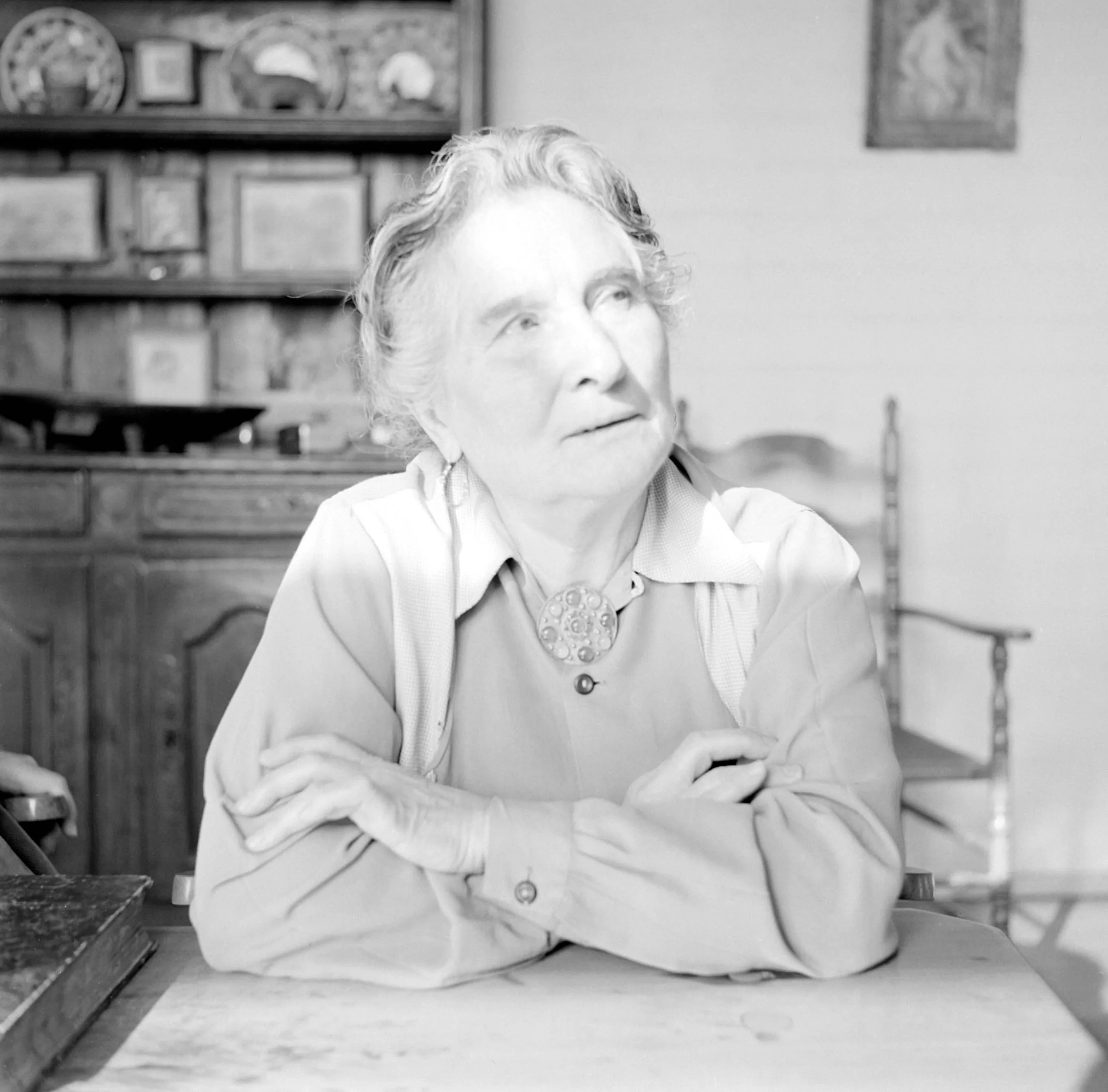 Black and white portrait photograph of an elderly woman seated at a table, arms crossed, looking upward, wearing a collared blouse and large round brooch