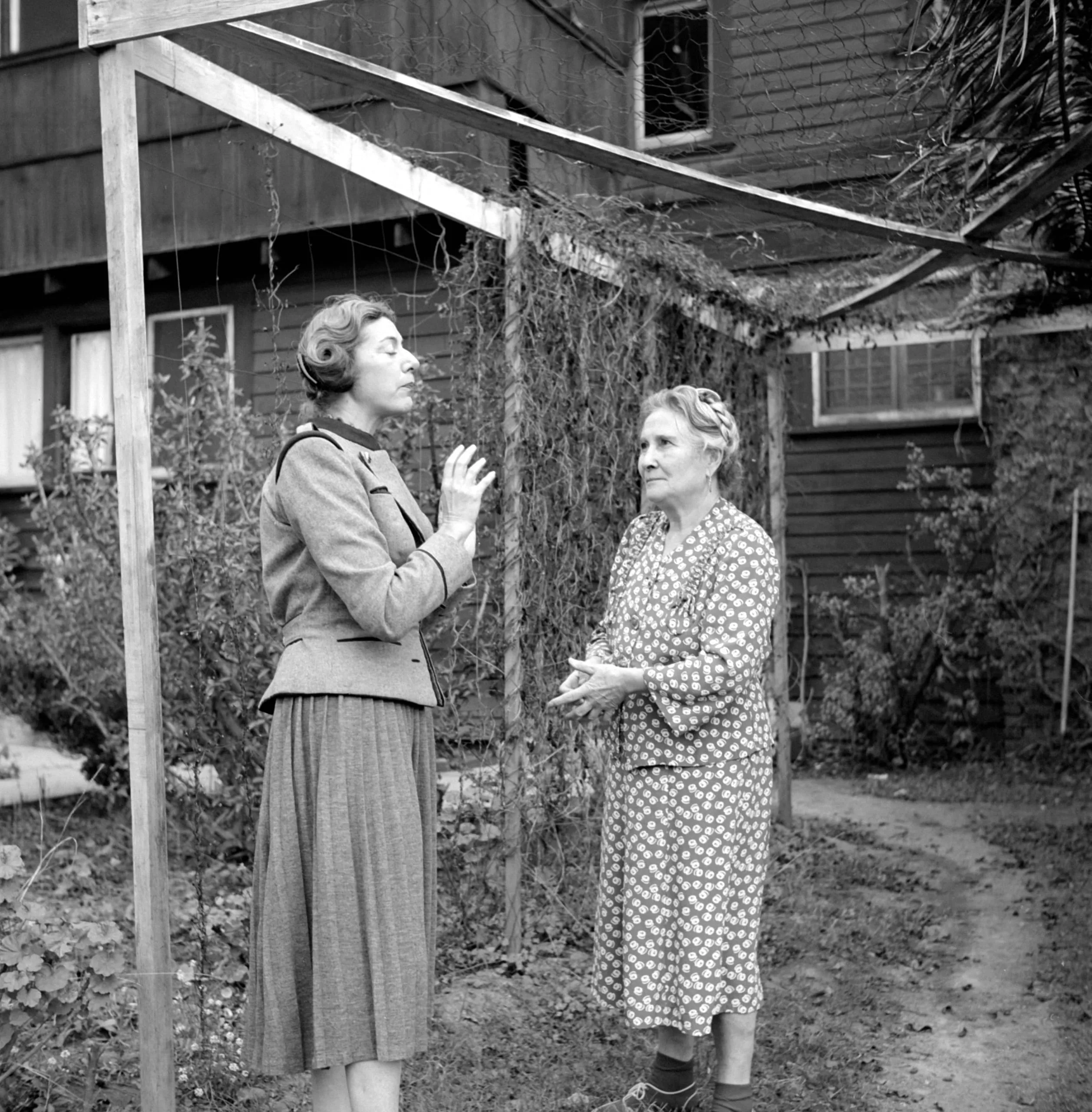 Black and white photograph of two women standing in a backyard garden beneath a wooden trellis, facing each other in conversation