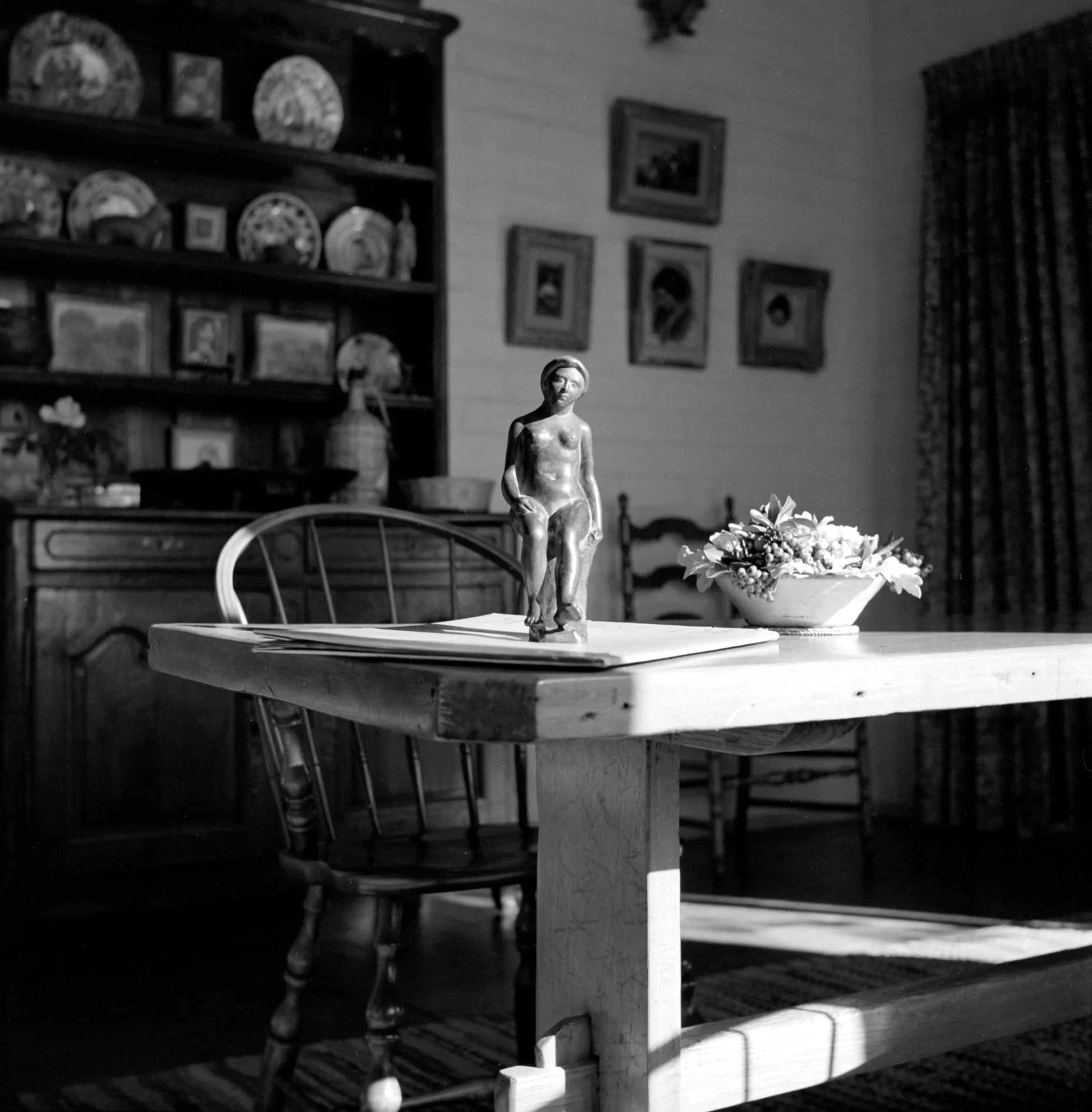 Black and white photograph of a pale wooden table holding a small bronze-toned nude figurative sculpture on a book, with a flower-filled bowl nearby, in a furnished room with a hutch and framed pictures
