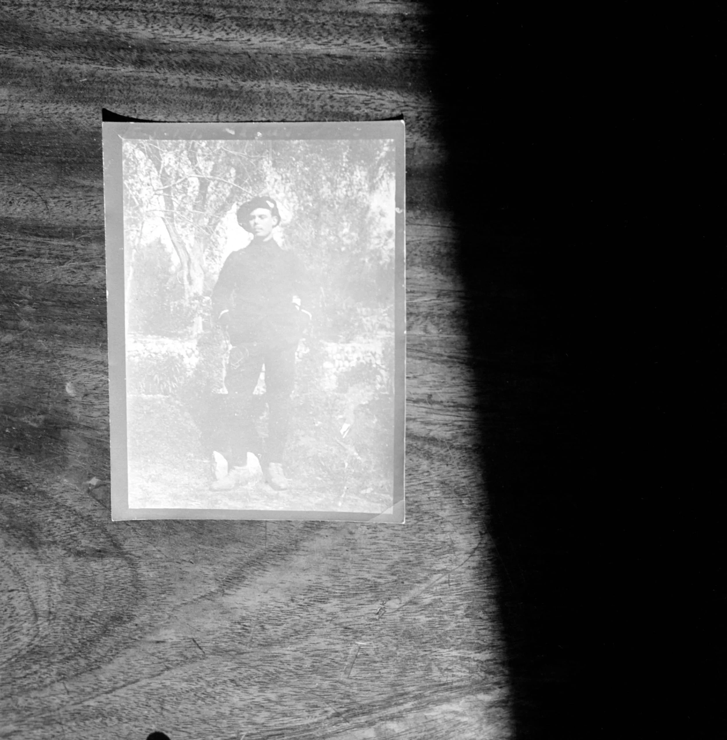 Black and white photograph of an overexposed or negative print of a standing figure in a hat, taped to a wood-grain surface, with a large black shadow filling the right side