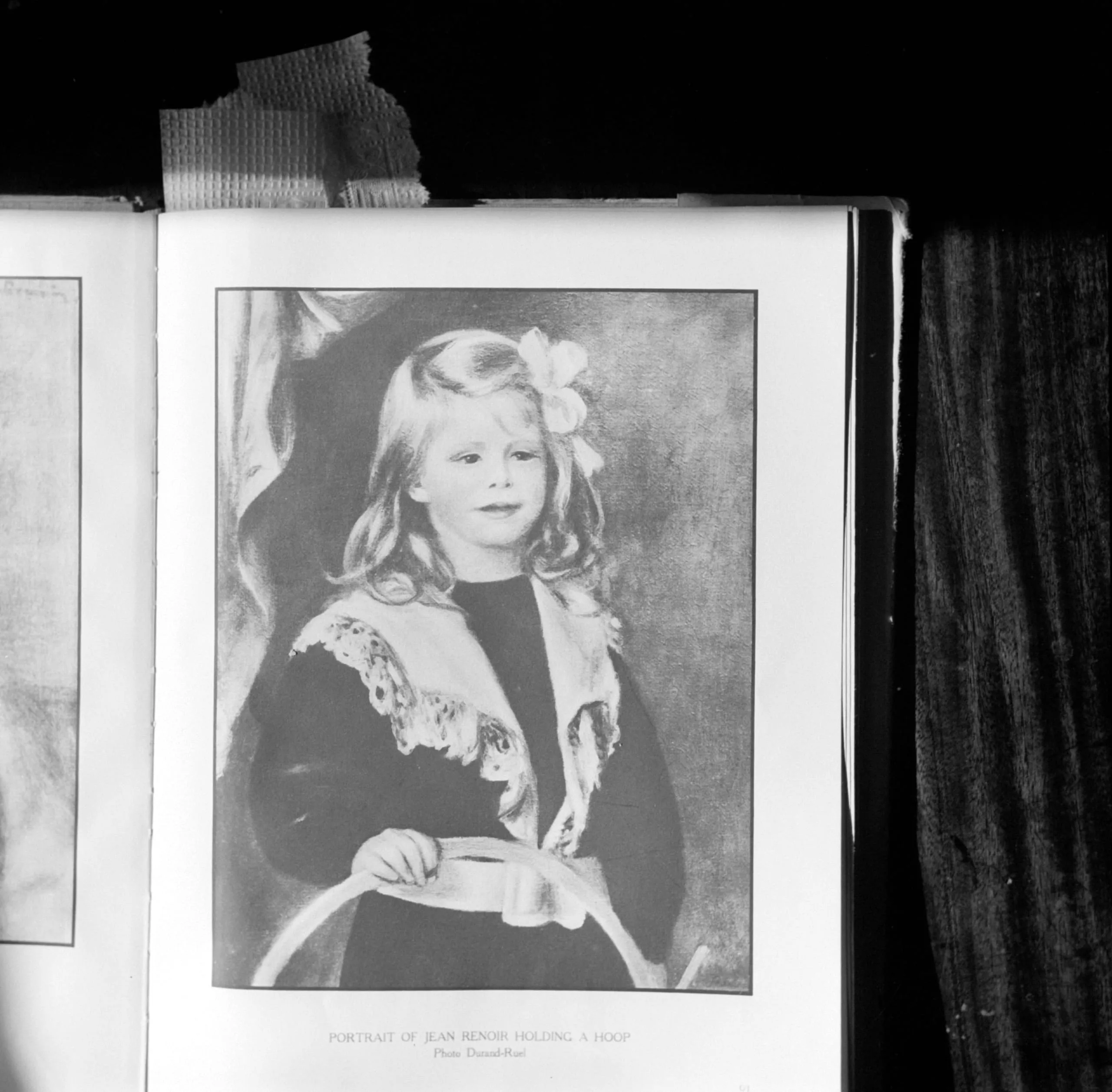 Black and white halftone print in an open book, full-length portrait of a young child with wavy blonde hair holding a large hoop, wearing a dark dress with lace collar