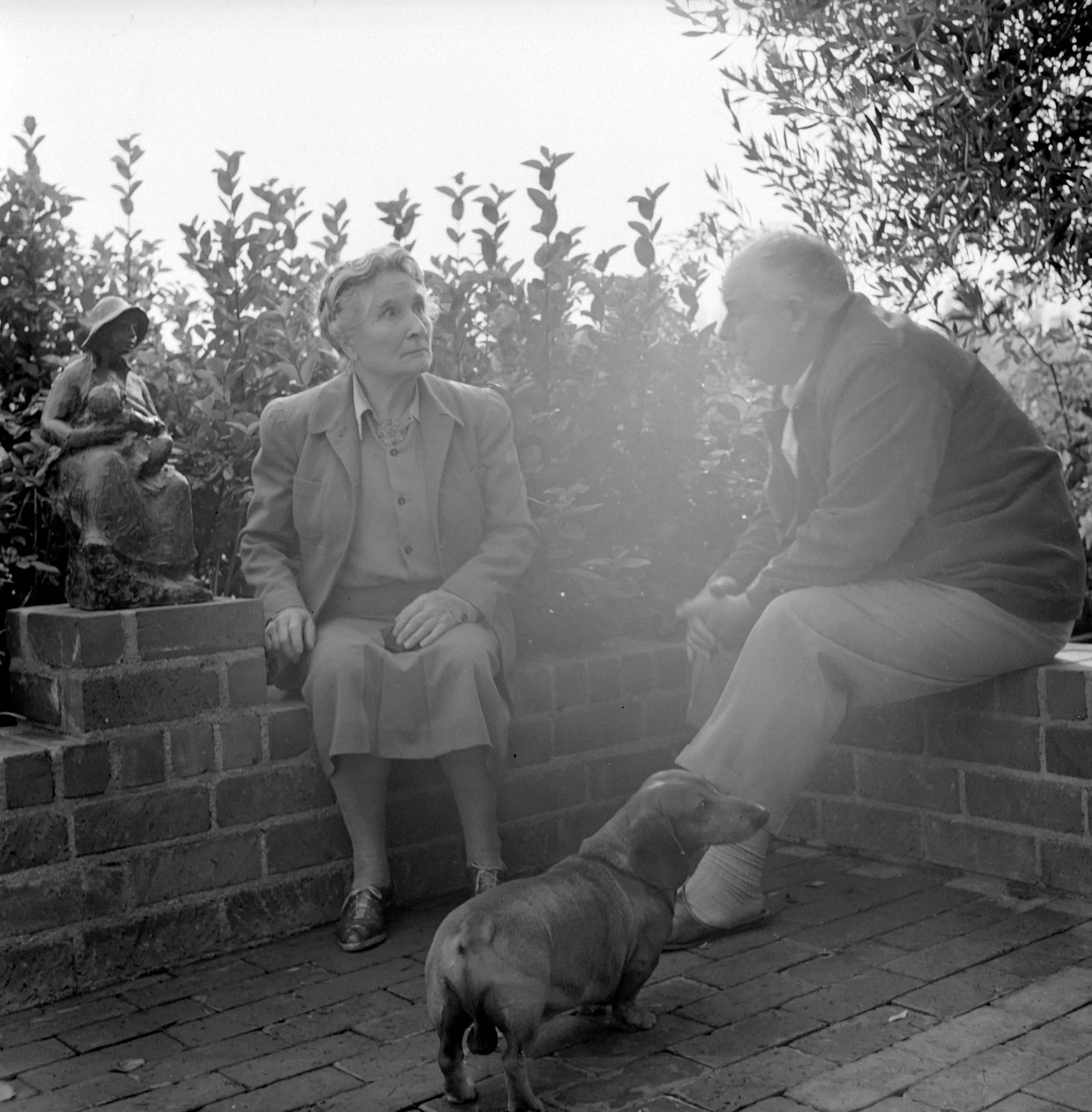 Black and white photograph of two older adults seated on a low brick garden wall conversing, with a dachshund on the brick paving below and a small garden sculpture to the left