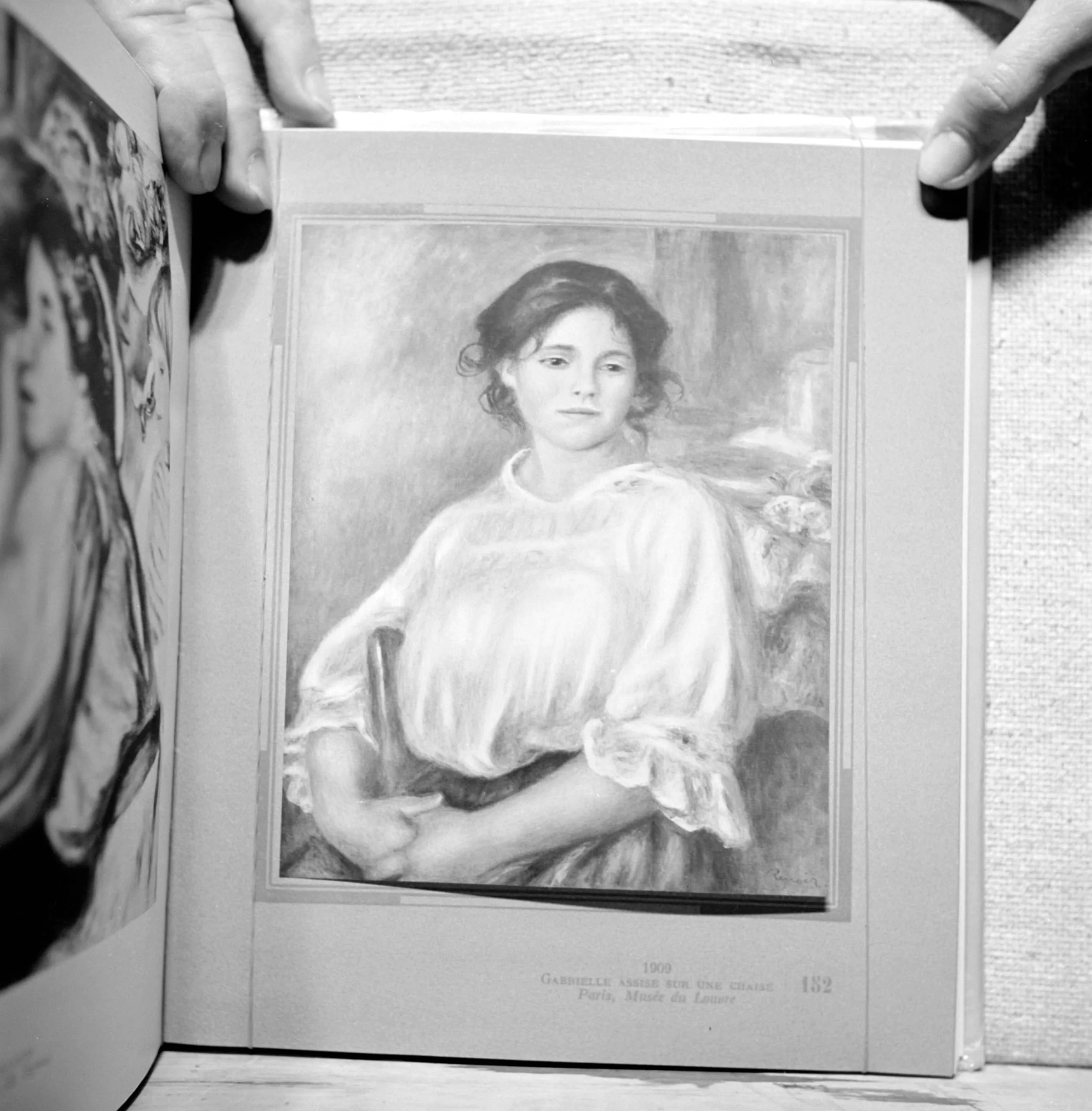 Black and white photograph of hands holding open a book to a page reproducing a painted portrait of a dark-haired young woman in a white blouse, with printed French caption below