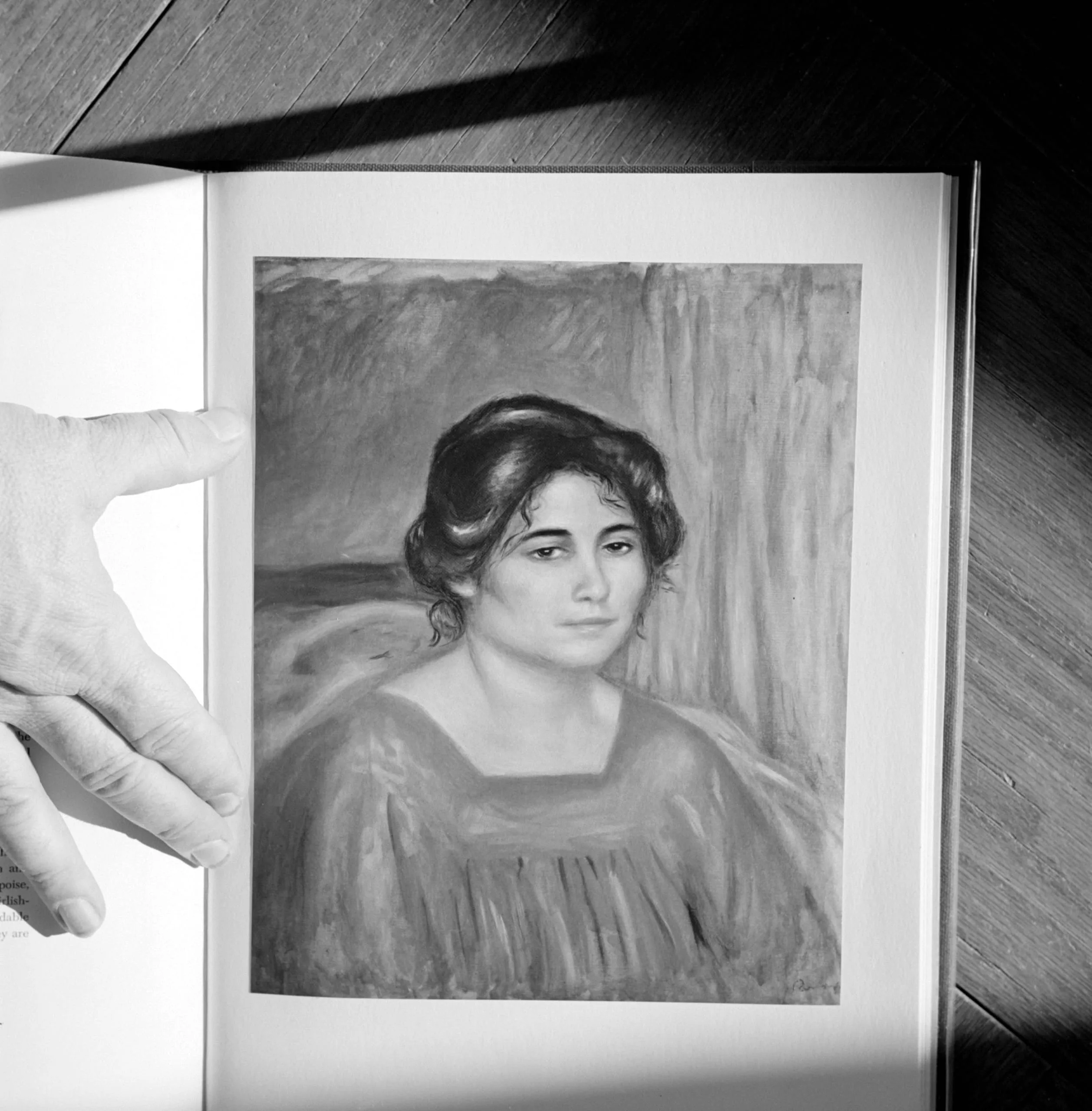 Black and white photograph of an open art book on a dark wood surface, showing a printed reproduction of an Impressionist-style painted portrait of a woman in a loose blouse