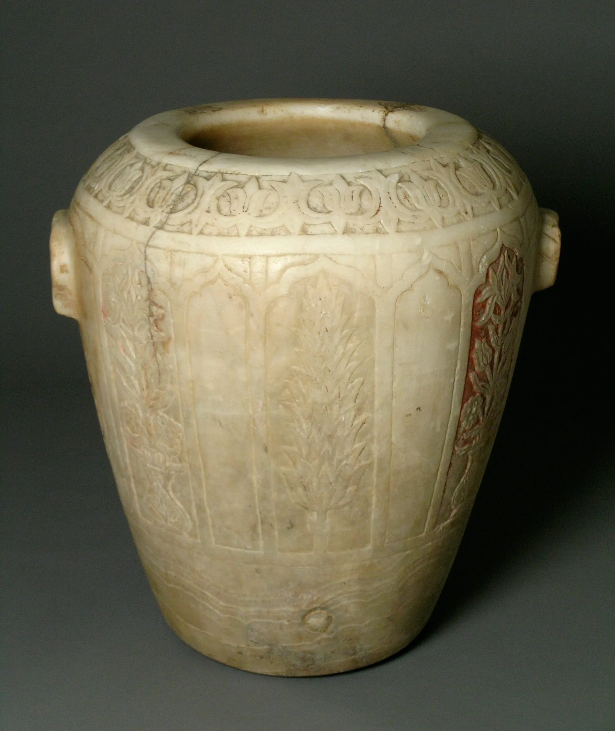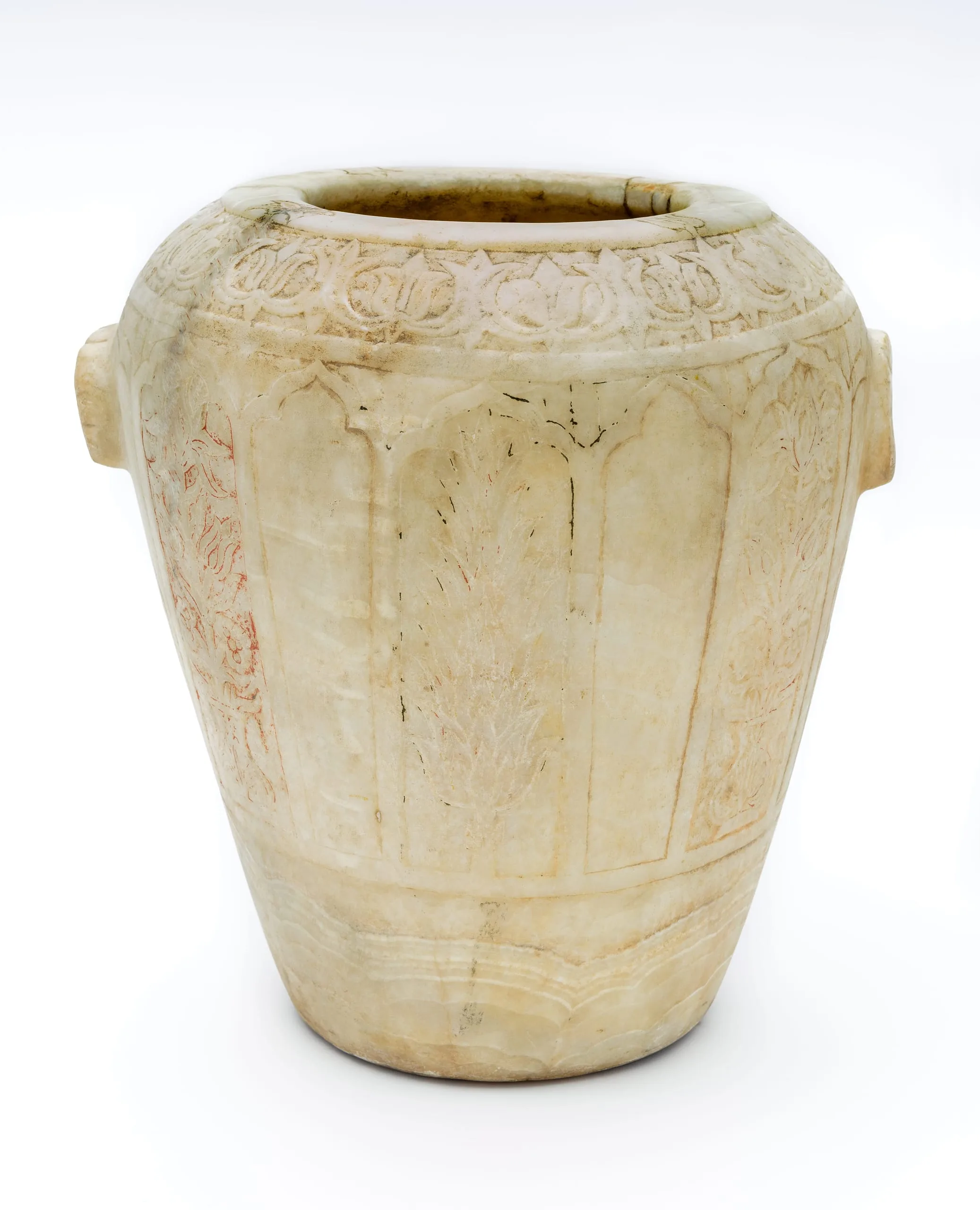 Many portable Islamic objects, including this marble water vessel, often have led long and varied lives. Jars of this type were well known in premodern Egypt and may have been originally used to store water in a religious institution. We know that this example eventually traveled to the United States, where it was exhibited at the Egyptian pavilion of the Centennial International Exhibition of 1876 in Philadelphia. The jar remained in the country at the close of the fair and was eventually sold at auction in the 1970s and then purchased as a gift for the Los Angeles County Museum of Art.