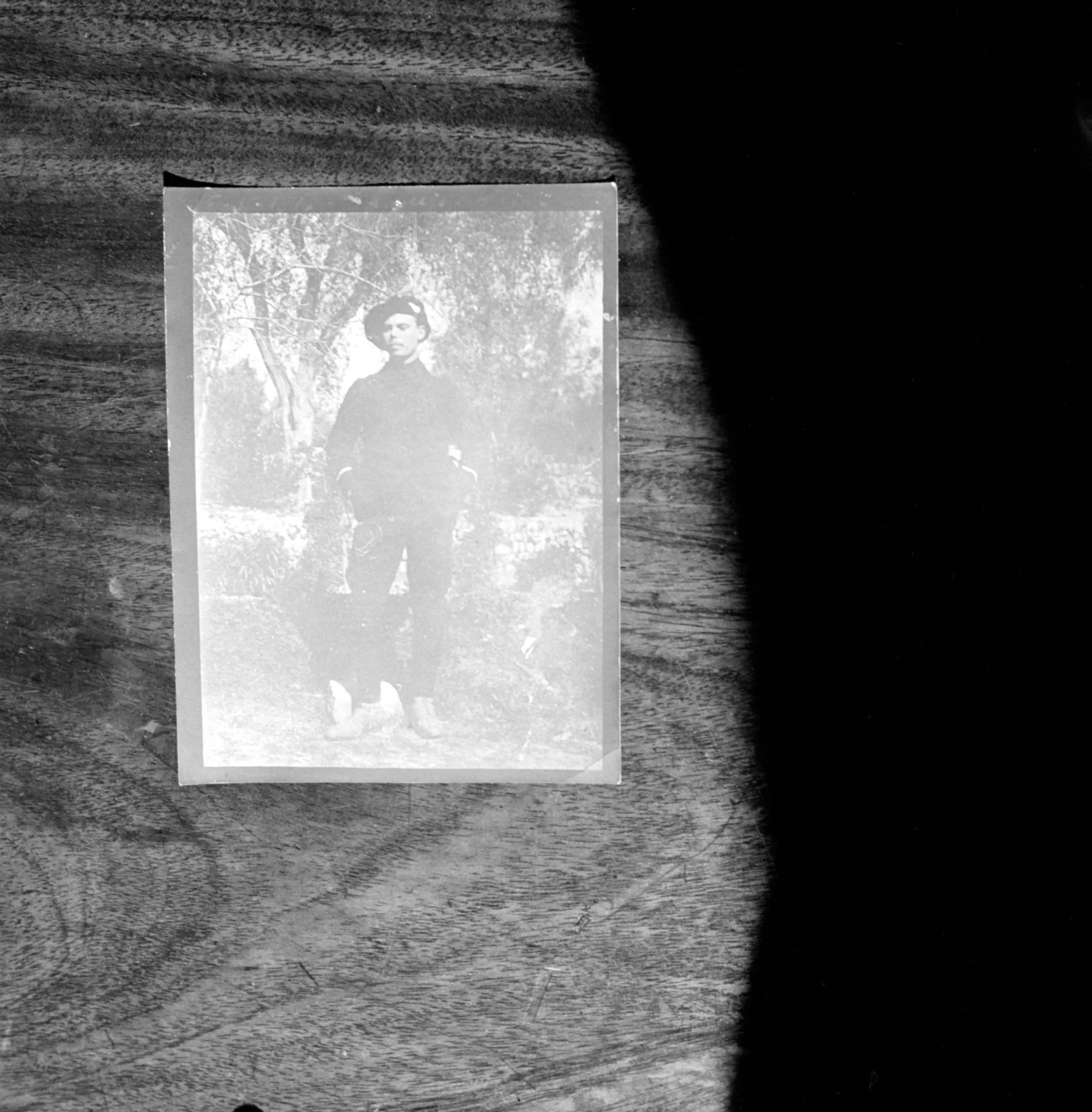 Black and white photograph of a faded, overexposed snapshot of a standing man in dark clothing and a cap, resting on a wood-grain surface with a large curved shadow across the right side