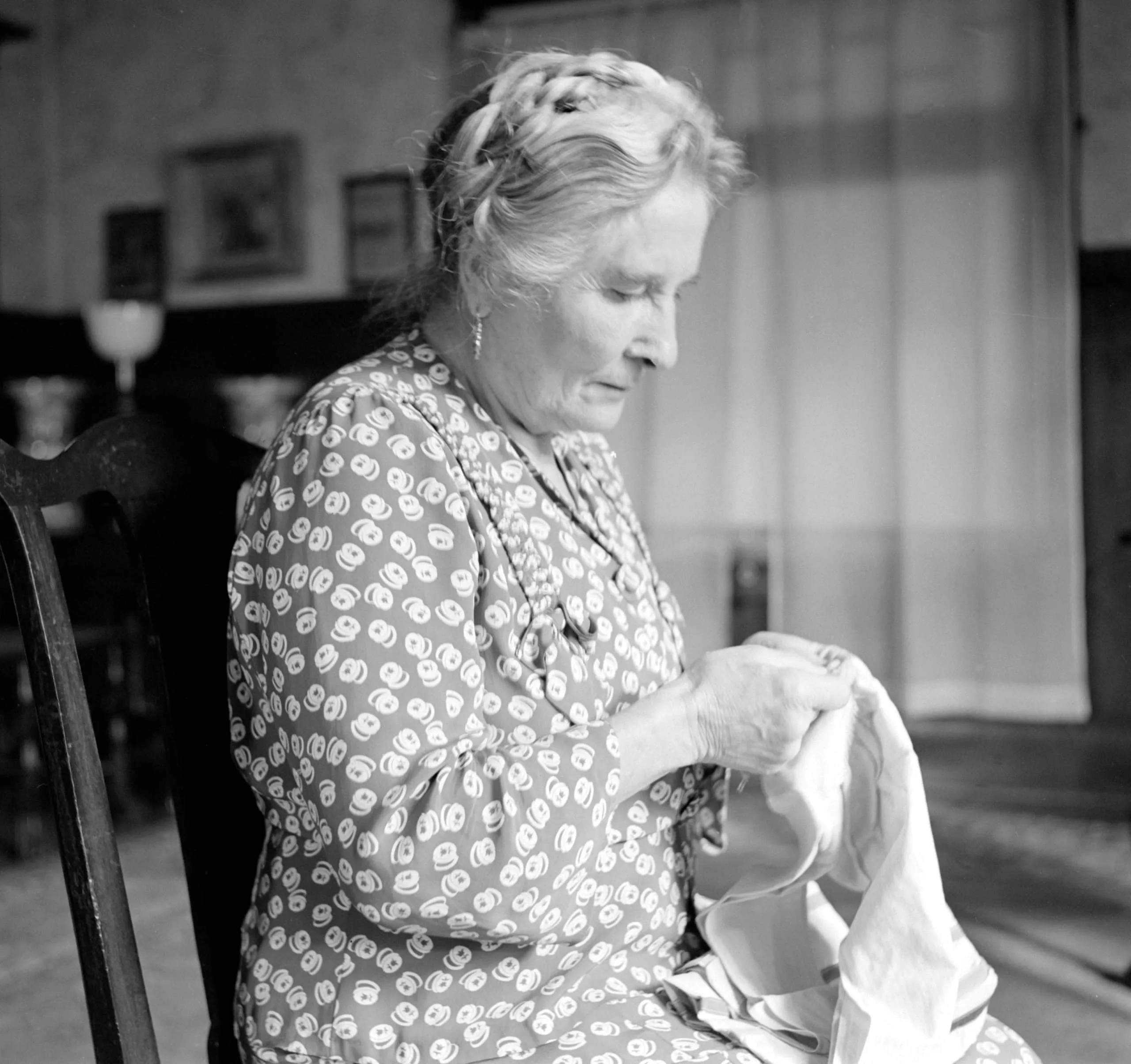 Black and white photograph of an elderly white woman seated in a wooden chair, head bowed over pale fabric she holds in her hands, wearing a patterned dress