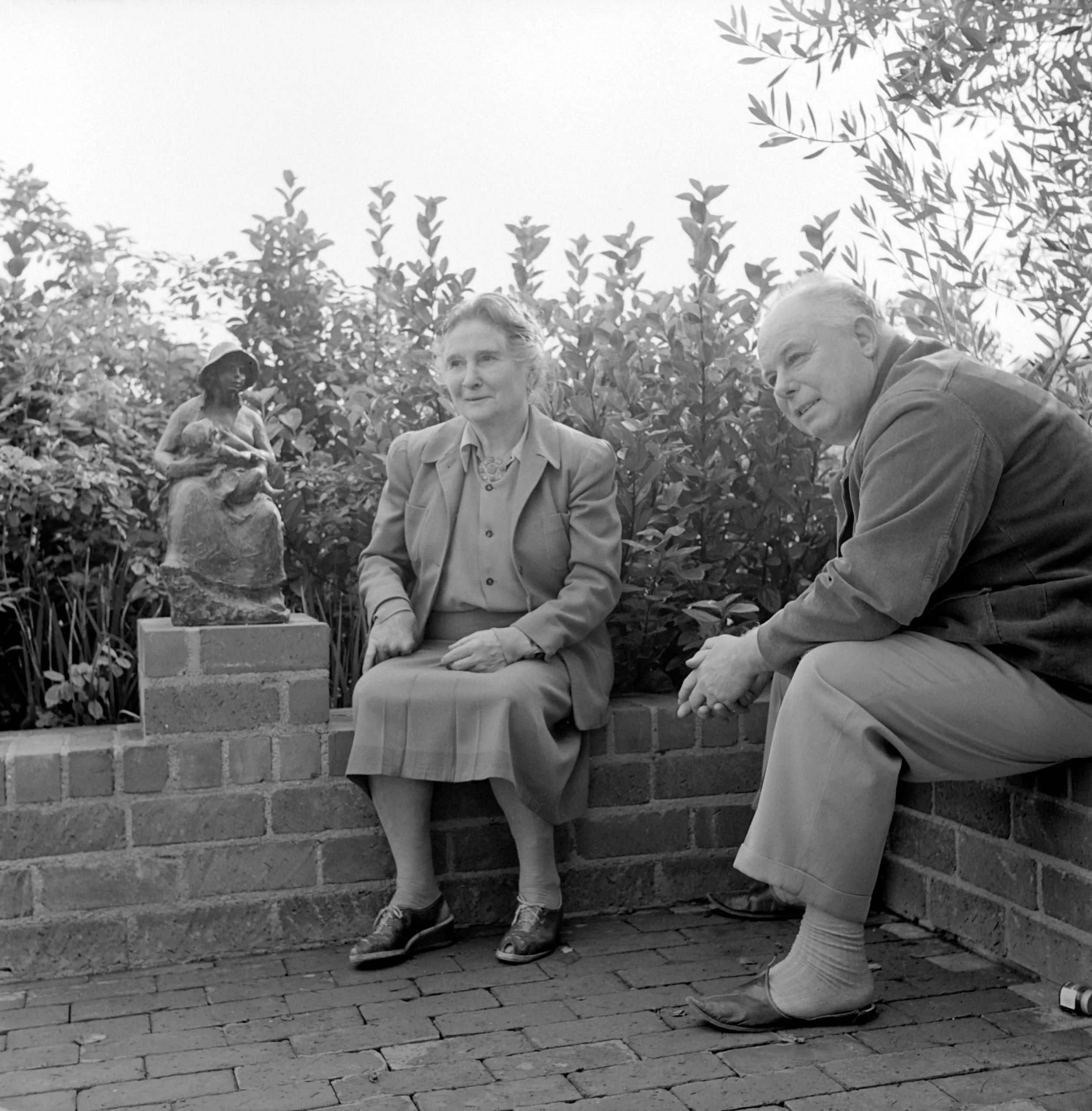 Black and white photograph of a man and woman seated on a low brick garden wall, with a small figurative sculpture visible behind them amid dense shrubbery