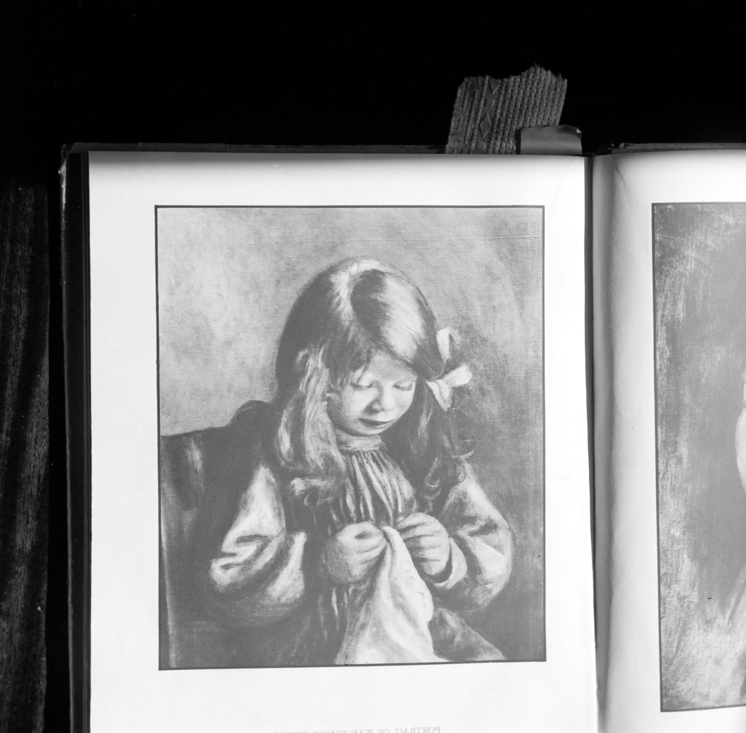 Print in an open book reproducing a painterly portrait of a young girl with loose hair and a bow, head bowed, hands gathered at her chest