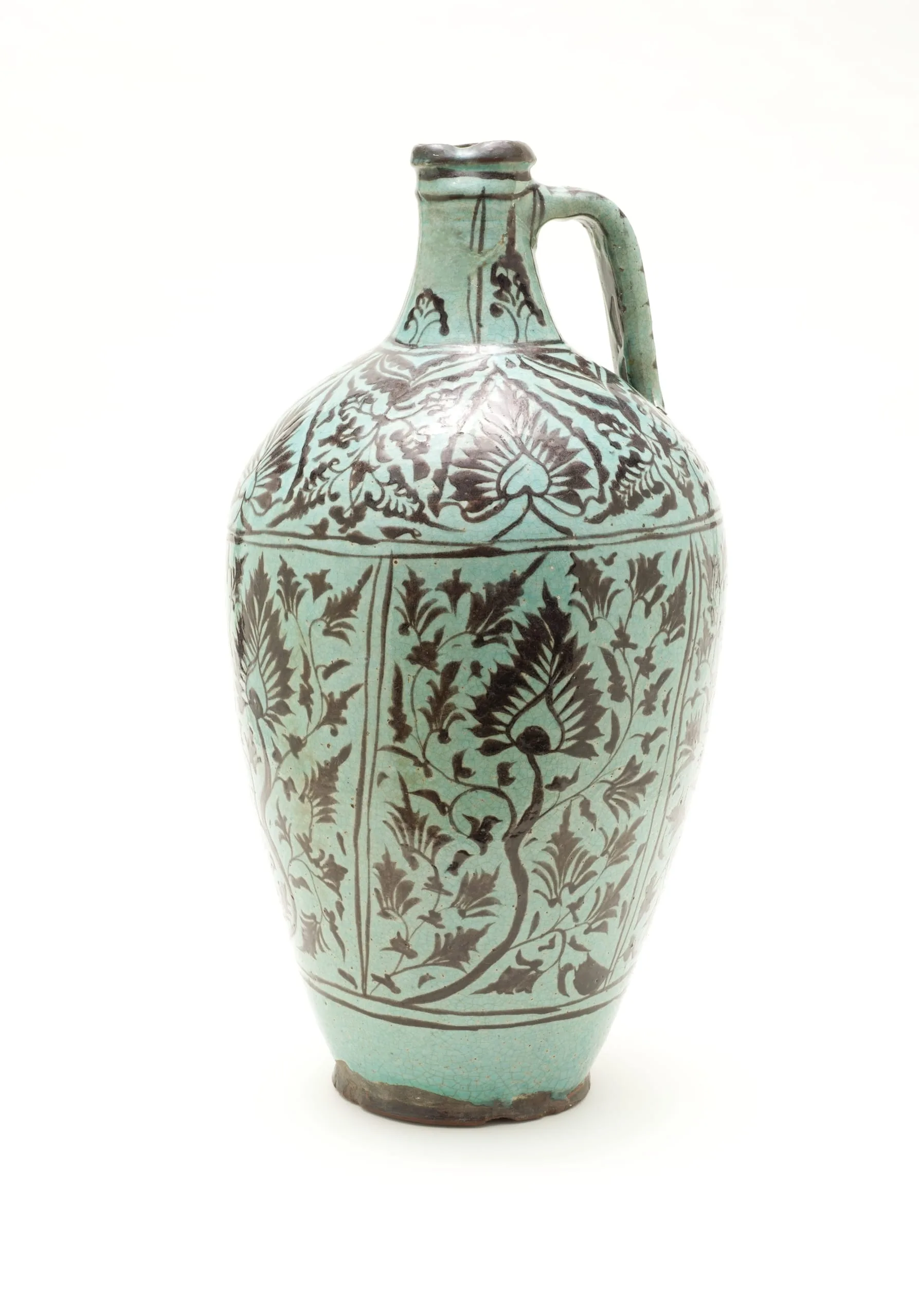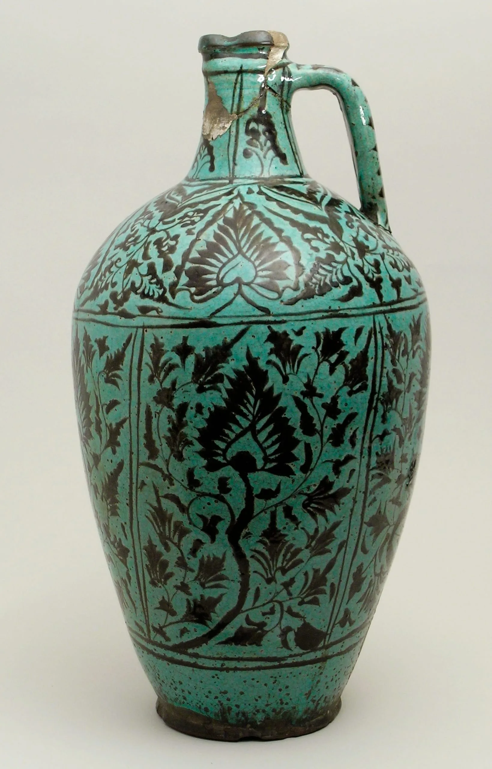 This glazed ceramic ewer and a related example (see M.2002.1.277) reflect some of the many changes that have taken place in the field of Islamic art history and perhaps also help to broaden our understanding of modern art. Both bear labels indicating that they were lent to the first great exhibition of Islamic art, held in Munich in 1910. It is now more than one hundred years later, but they have actually grown even older during that time. Ascribed to eighteenth-century Turkestan in the 1910 catalogue, these ewers can now be assigned to the late fifteenth or early sixteenth century. Among the many distinguished visitors to the Munich exhibition was the artist Henri Matisse (1869–1954), and it is easy to imagine that he may have preserved a visual memory of objects such as these ceramic ewers, whose colorful floral ornament is echoed in his works.