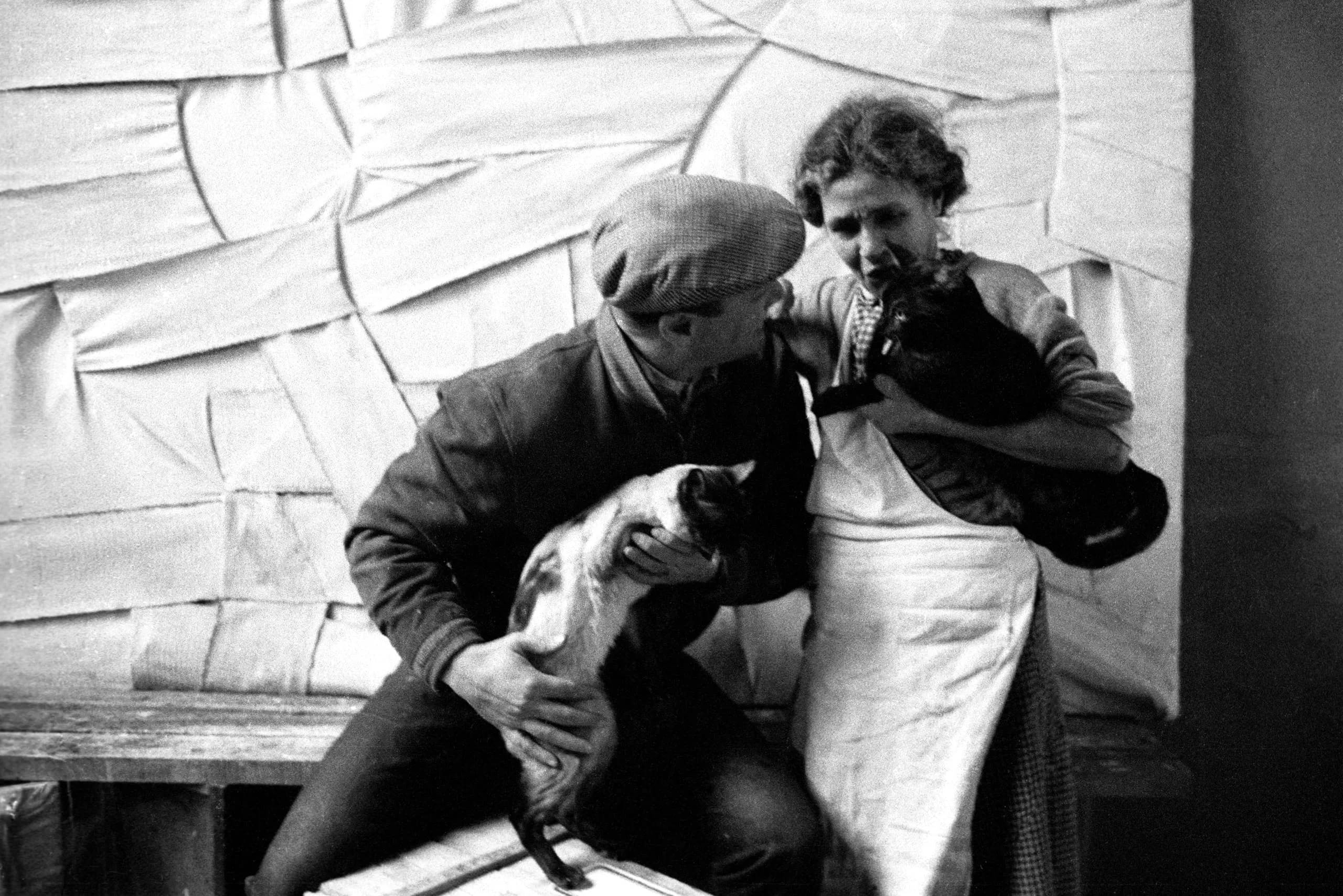 Black and white photograph of two people seated close together, each holding a cat, against a wall covered in overlapping pale fabric panels