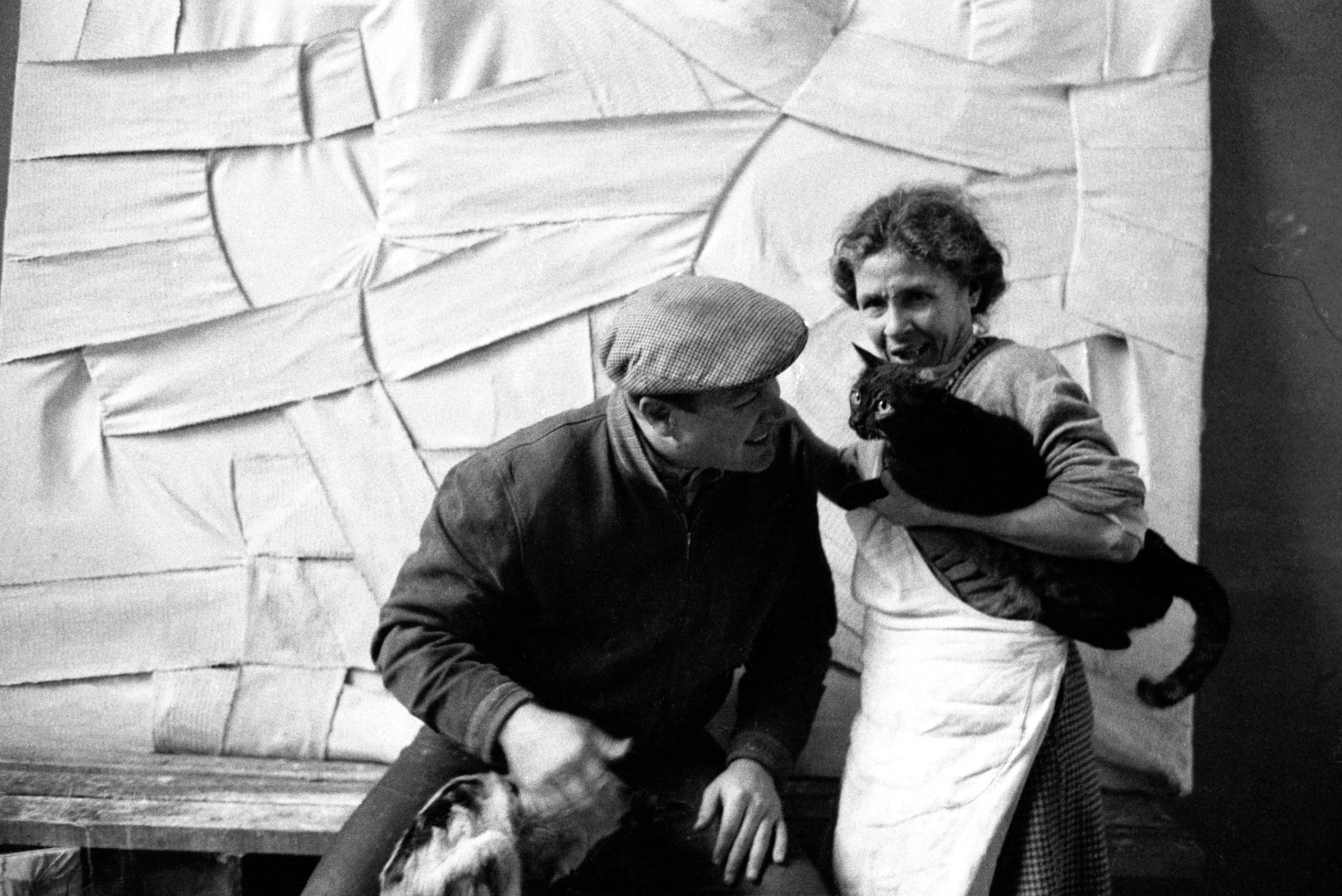 Black and white photograph of a man in a flat cap and a woman in an apron holding a black cat, standing before a large canvas of overlapping fabric strips