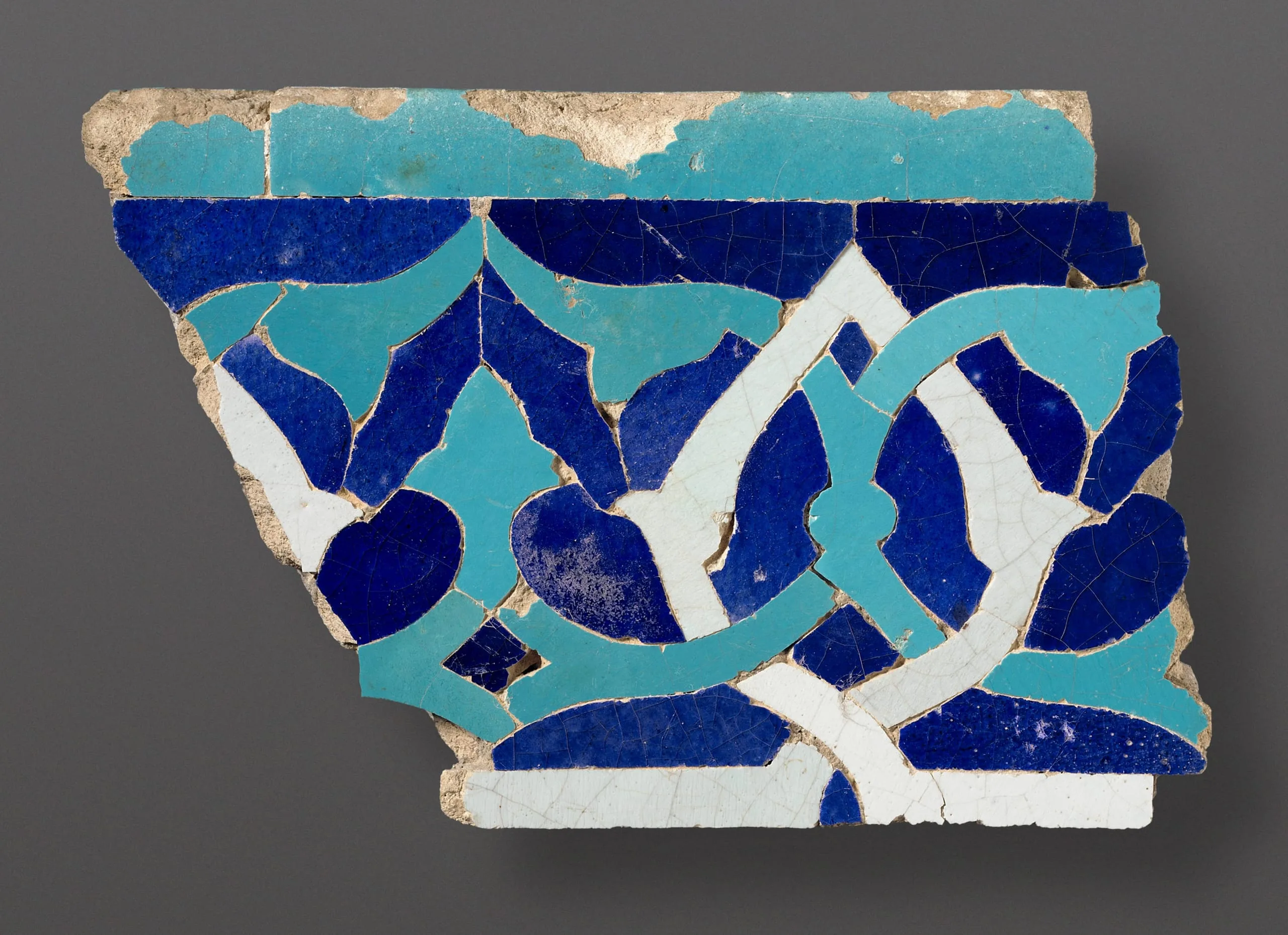 Of the principal capitals of the Mongol Ilkhanid dynasty (1256-1353), only Sultaniyya, still preserves a major royal monument, the mausoleum of Sultan Öljeitü (r. 1304-16), who transferred the seat of government to this former summer residence, in Northwestern Iran. Once part of a larger complex, the mausoleum was extensively decorated with colorful tilework, including a frieze on the lower section in the southern rectangular chamber from which this section must have come. Here, the foliate design is picked out in cobalt blue, turquoise and white from precut pieces of glazed tile, assembled like a mosaic.