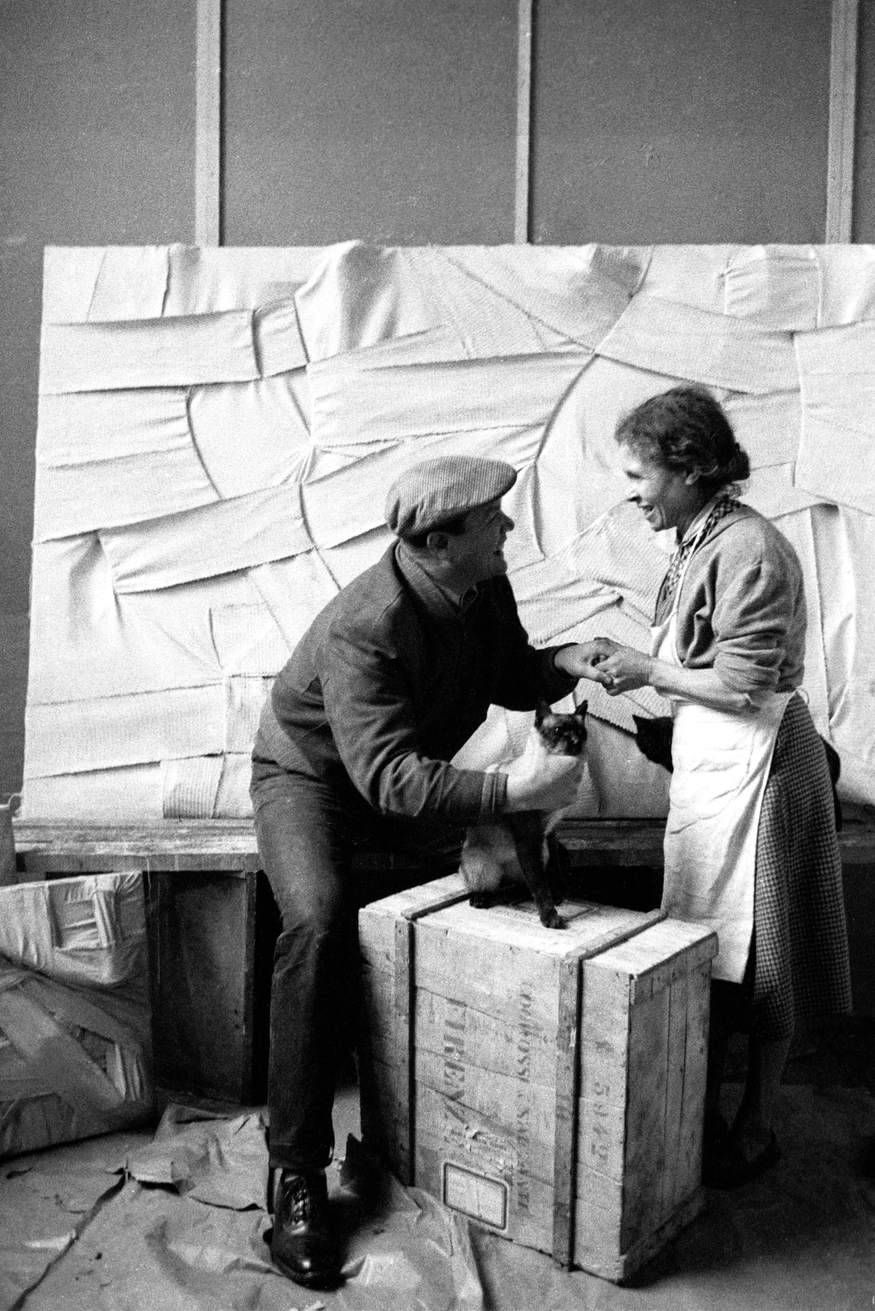 Black and white photograph of a man in a flat cap and a woman in an apron reaching toward a cat on a wooden crate, with a large textured canvas in the background
