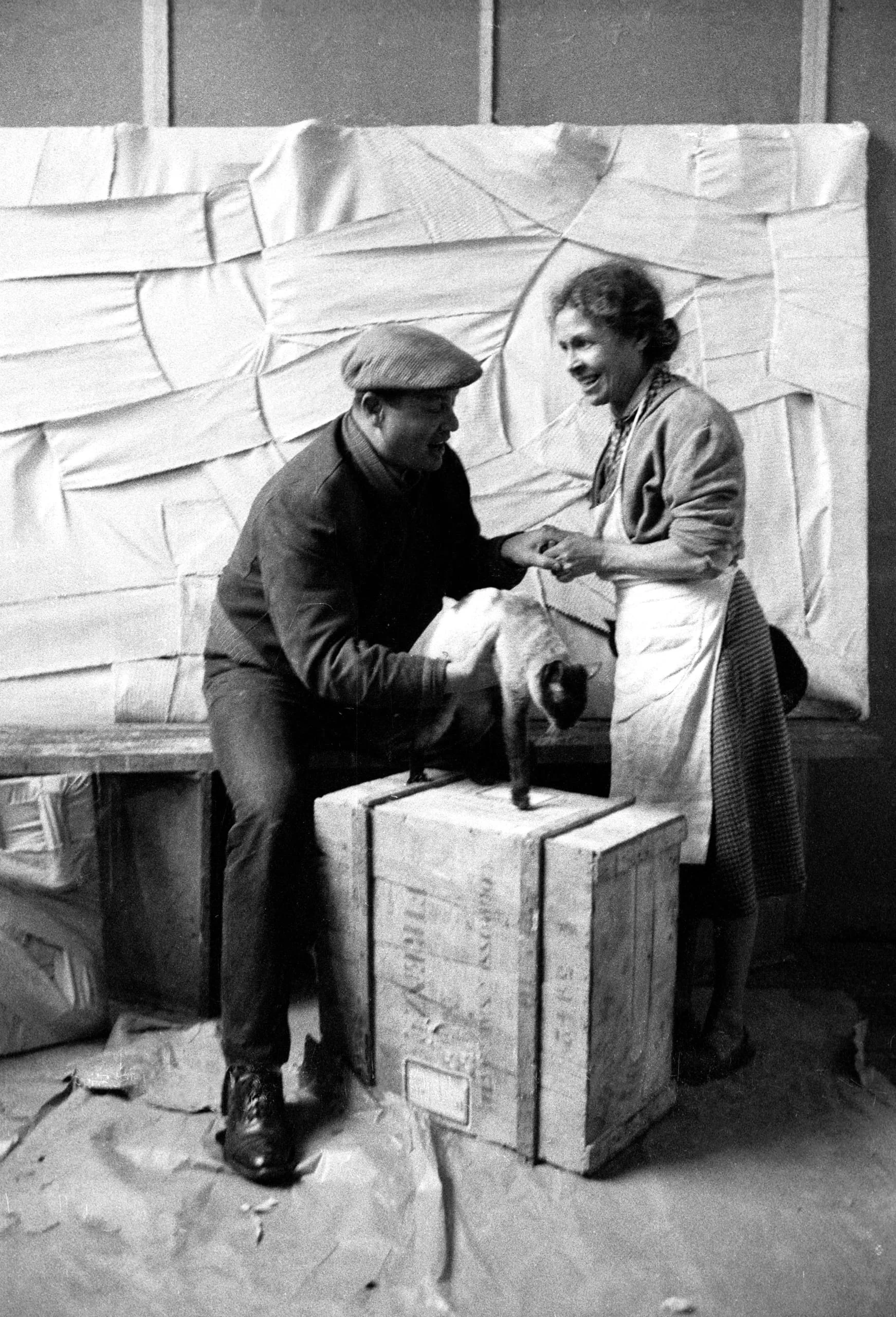 Black and white photograph of a man and woman laughing together in an artist's studio, with a cat on a wooden crate between them and a large textured relief artwork on the wall behind