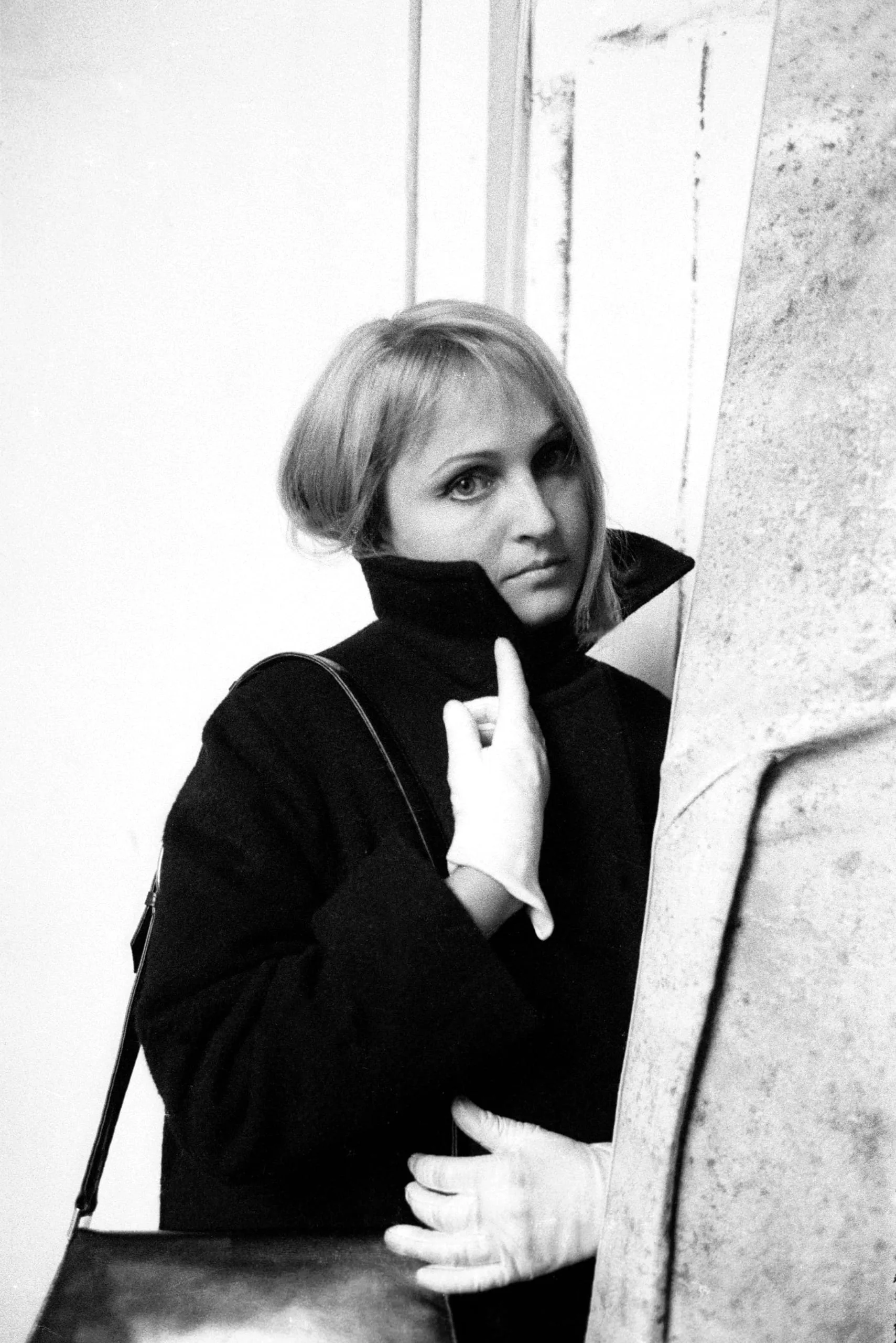 Black and white portrait photograph, a woman in a black coat leans against a stone column, one gloved hand raised to her chin, looking directly at the camera