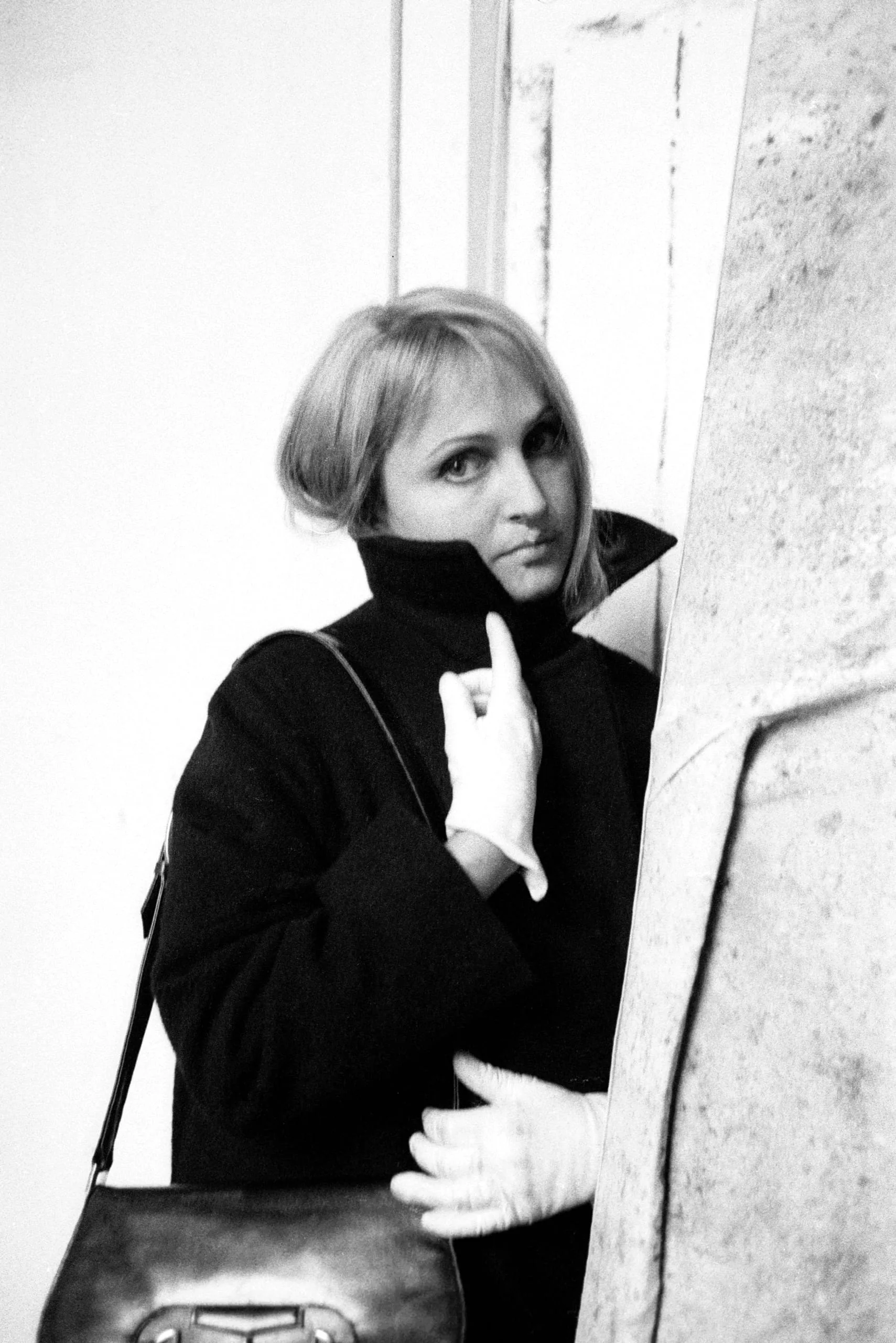 Black and white photograph, a woman in a dark turtleneck and pale gloves leans against a stone column, glancing over her shoulder toward the camera