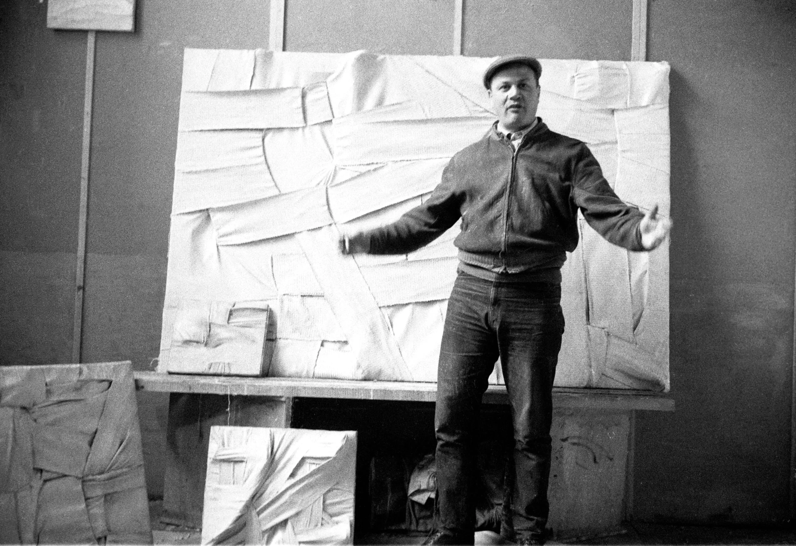 Black and white photograph of a man in a flat cap and jacket standing arms outstretched before a large textured fabric or paper relief in an artist's studio
