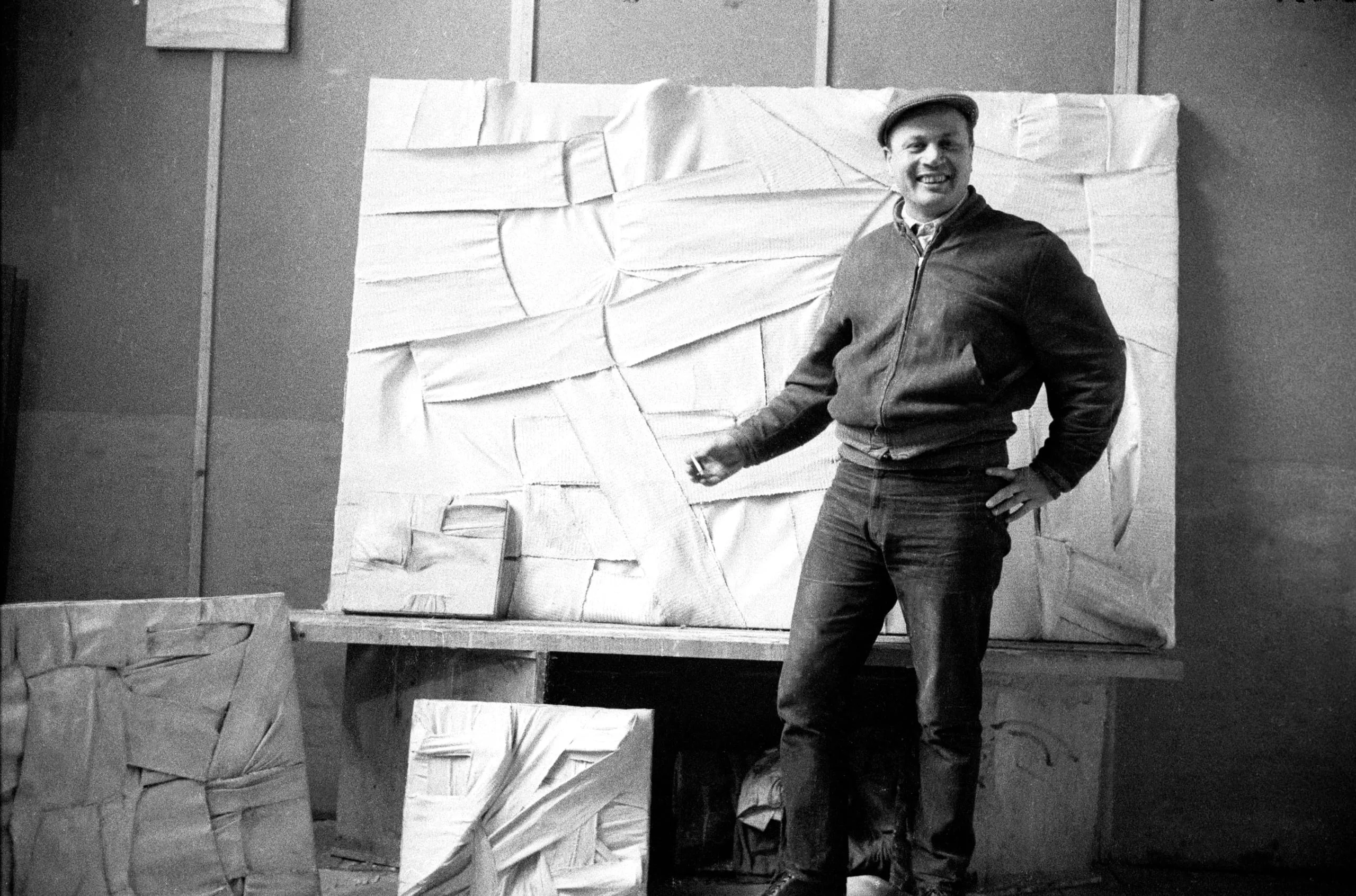 Black and white gelatin silver print of a smiling white man in a flat cap and jacket standing before a large, heavily textured relief work in an artist's studio