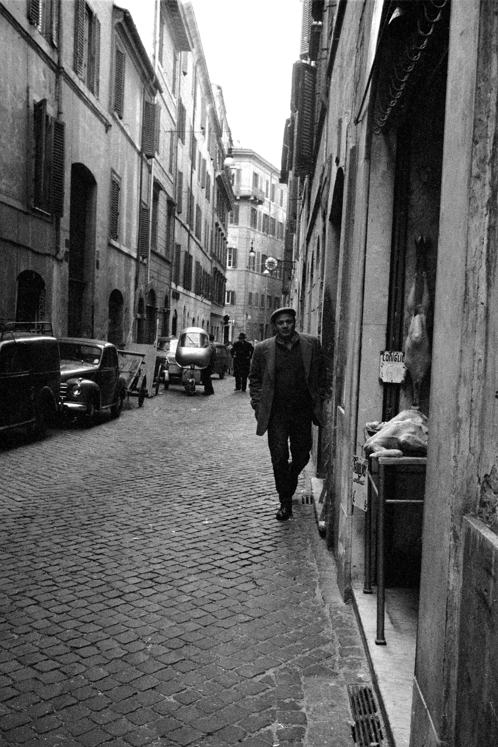 Black and white photograph of a man in a flat cap and dark jacket walking toward the camera on a narrow cobblestone street flanked by shuttered buildings