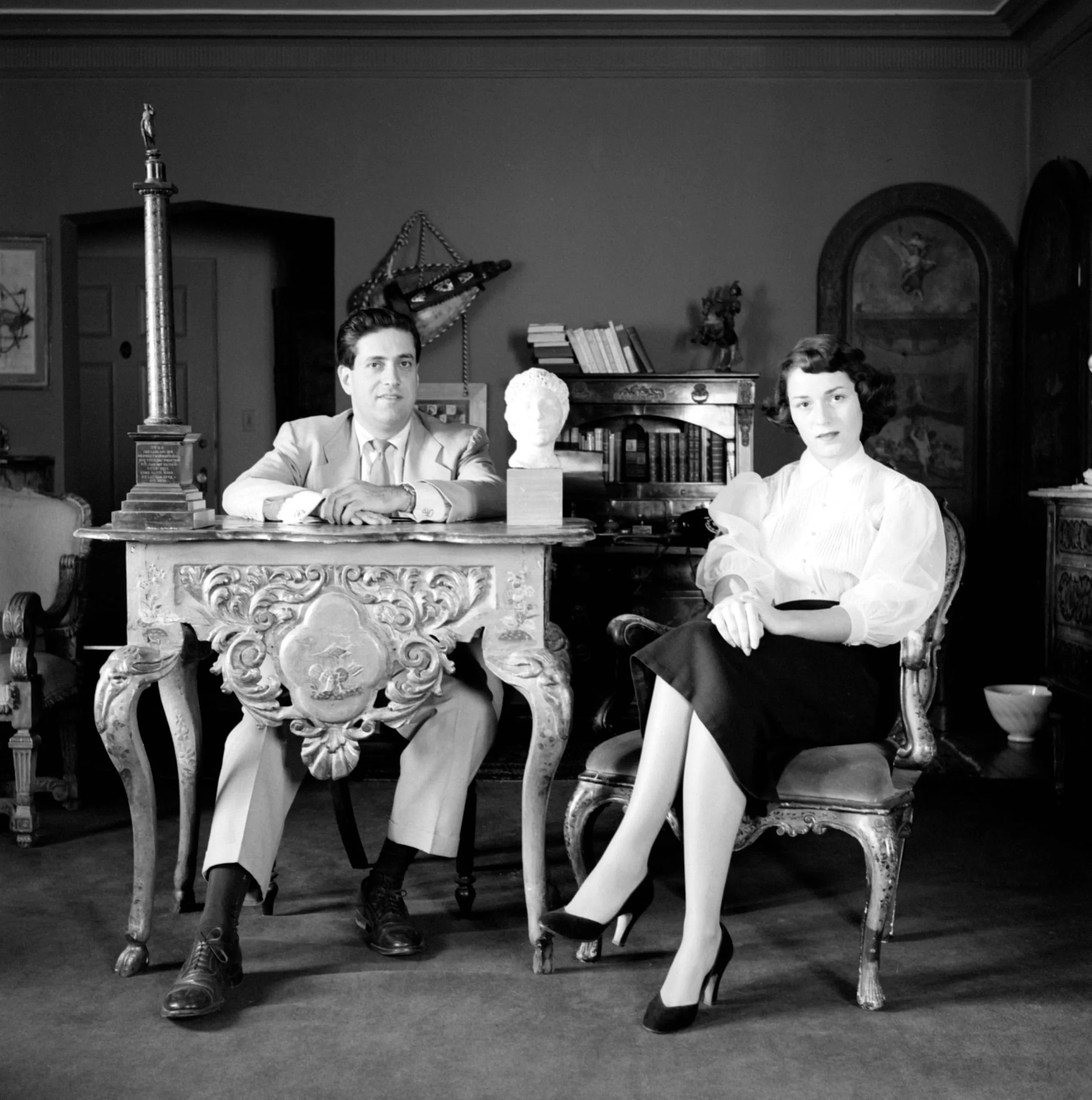 Black and white photograph of a man and woman seated in a room furnished with antique objects; man in suit leans on an ornately carved table, woman in blouse and skirt sits in a gilded chair beside it
