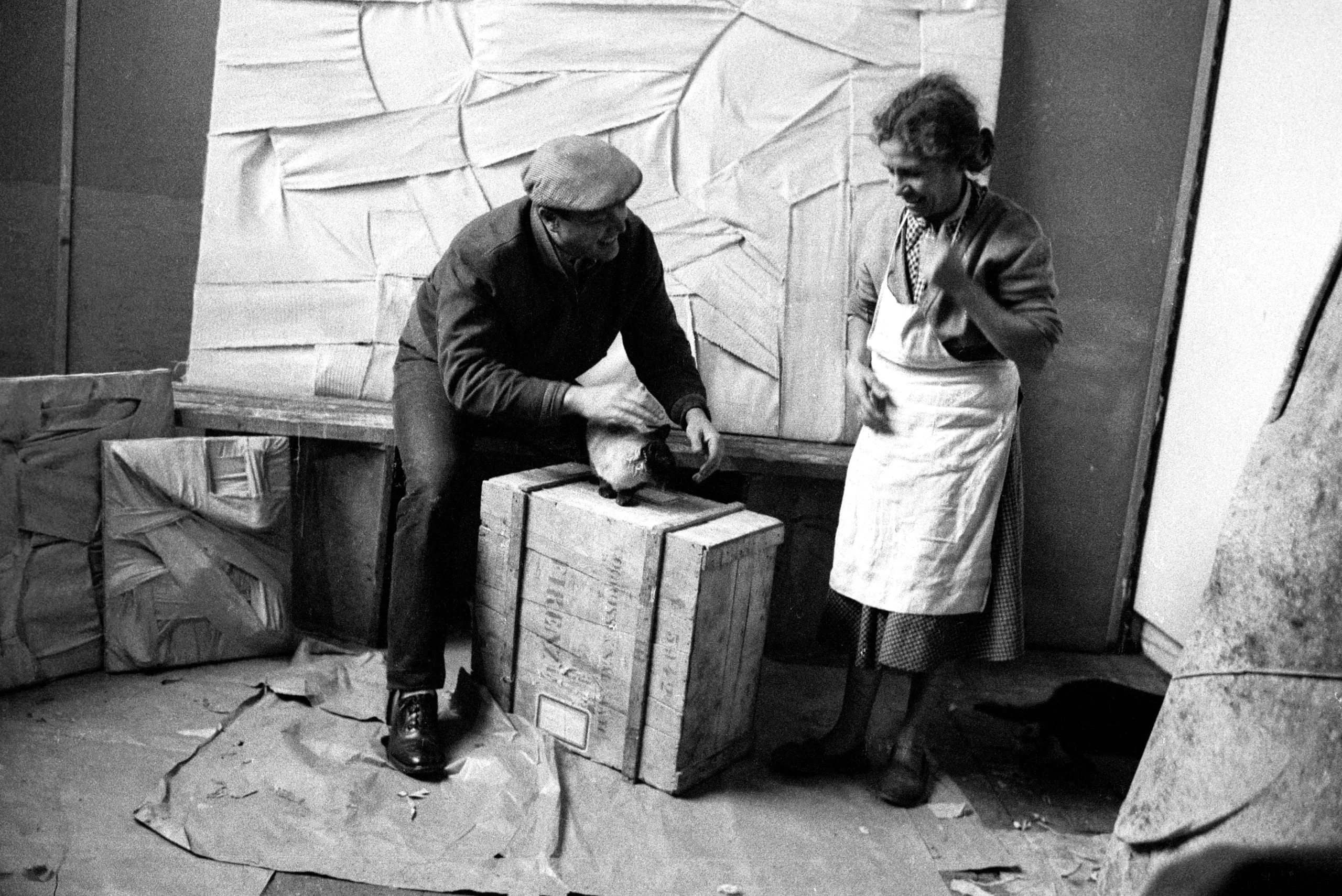 Black and white photograph of two people in a studio, one leaning over a wooden crate to work a rounded object, large textured relief panels in the background