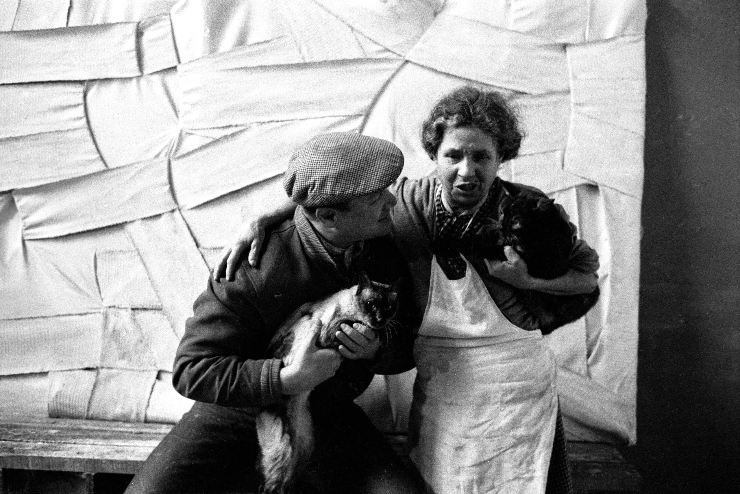 Black and white photograph of a man and woman seated together, each holding a cat, against a wall covered in overlapping fabric panels
