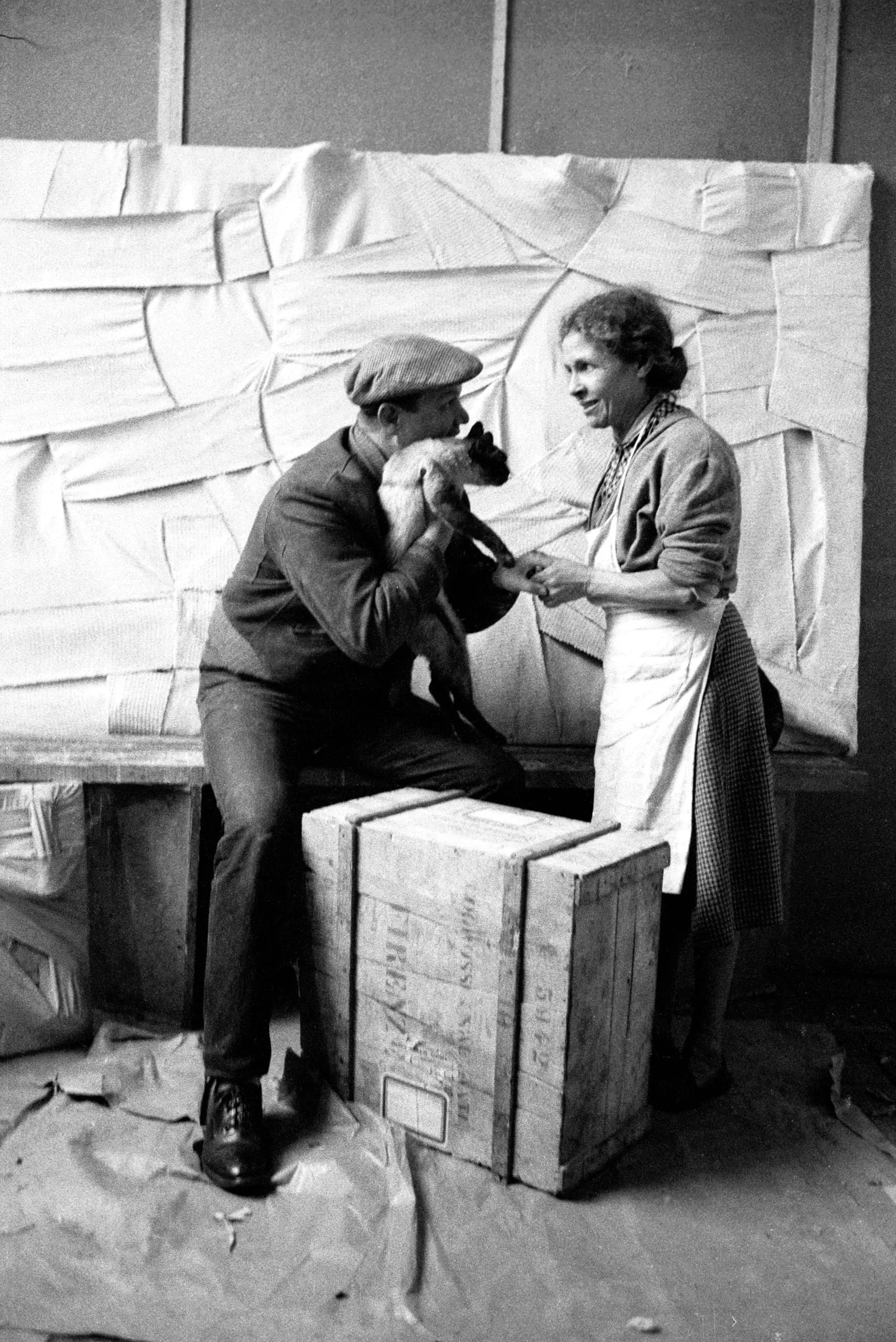 Black and white photograph of a man and woman in a studio, the man perched on wooden crates cradling a small dog while the woman reaches toward them
