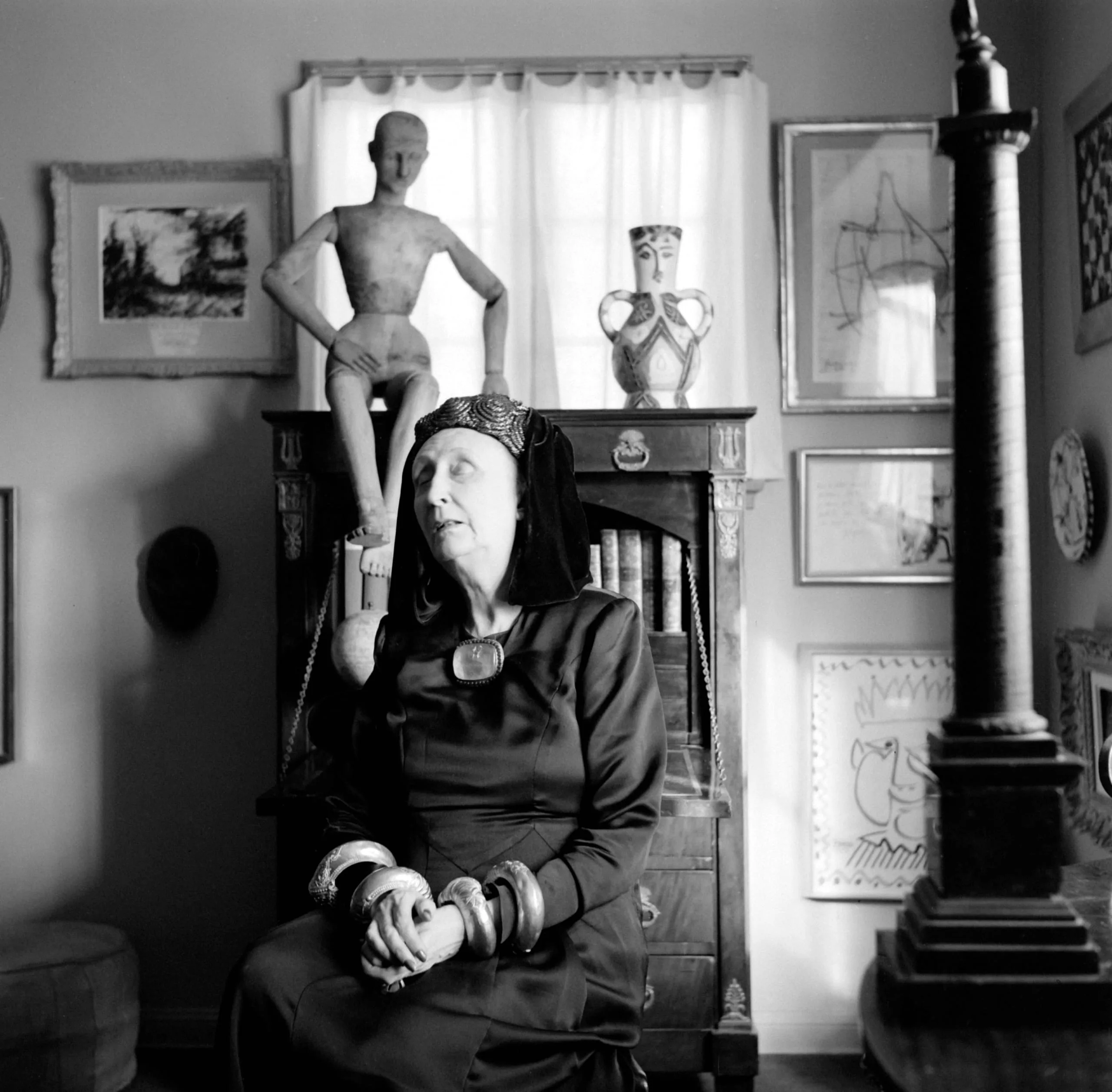 Black and white photograph, an older woman seated in a room filled with sculptures and framed artworks, wearing a dark hood, large pendant, and wide stacked metal cuff bracelets