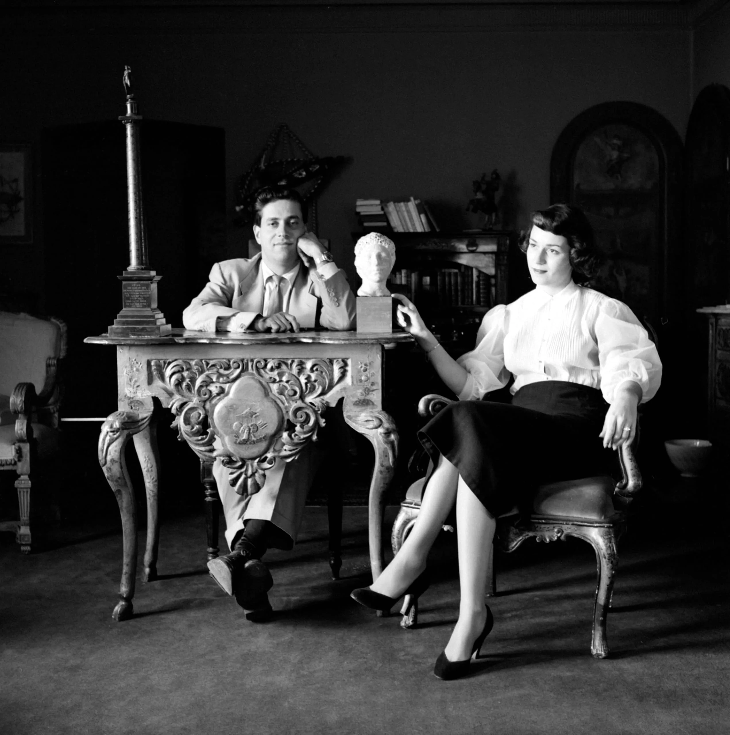 Black and white photograph of a man and woman posed in a furnished interior, seated at an ornately carved console table with a classical bust