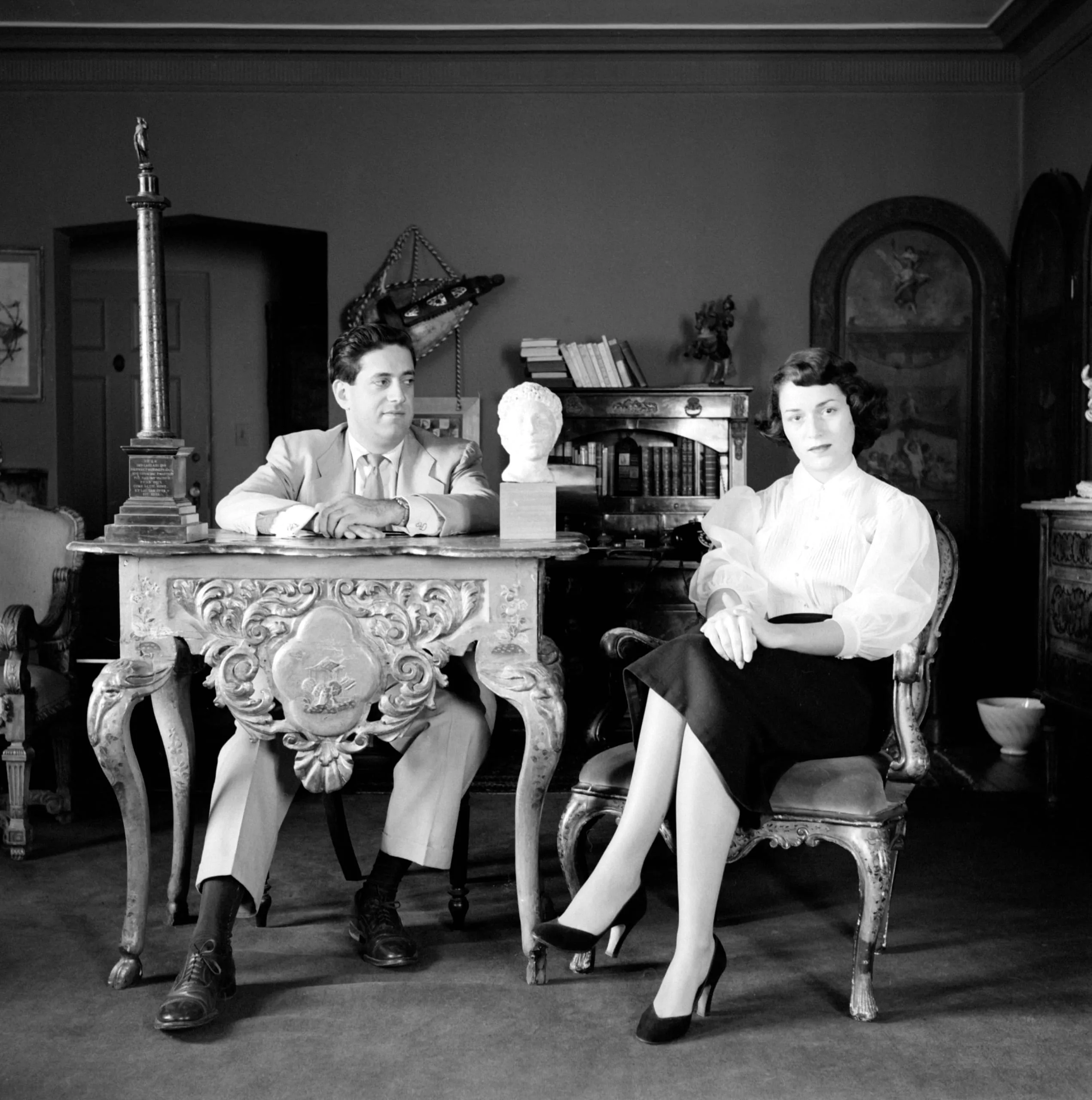 Black and white photograph of a man and woman seated in an ornate interior, he leaning on a carved console table, she in a gilded armchair, both facing the camera