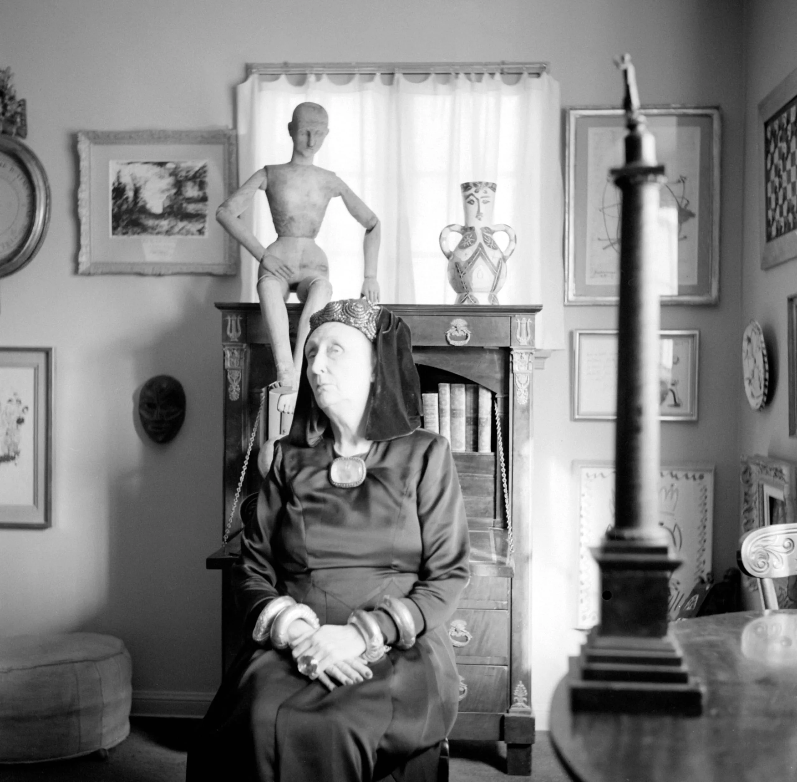 Black and white portrait photograph of a white woman seated in a chair, wearing a dark veil and ornate headband, surrounded by sculptures and framed artworks