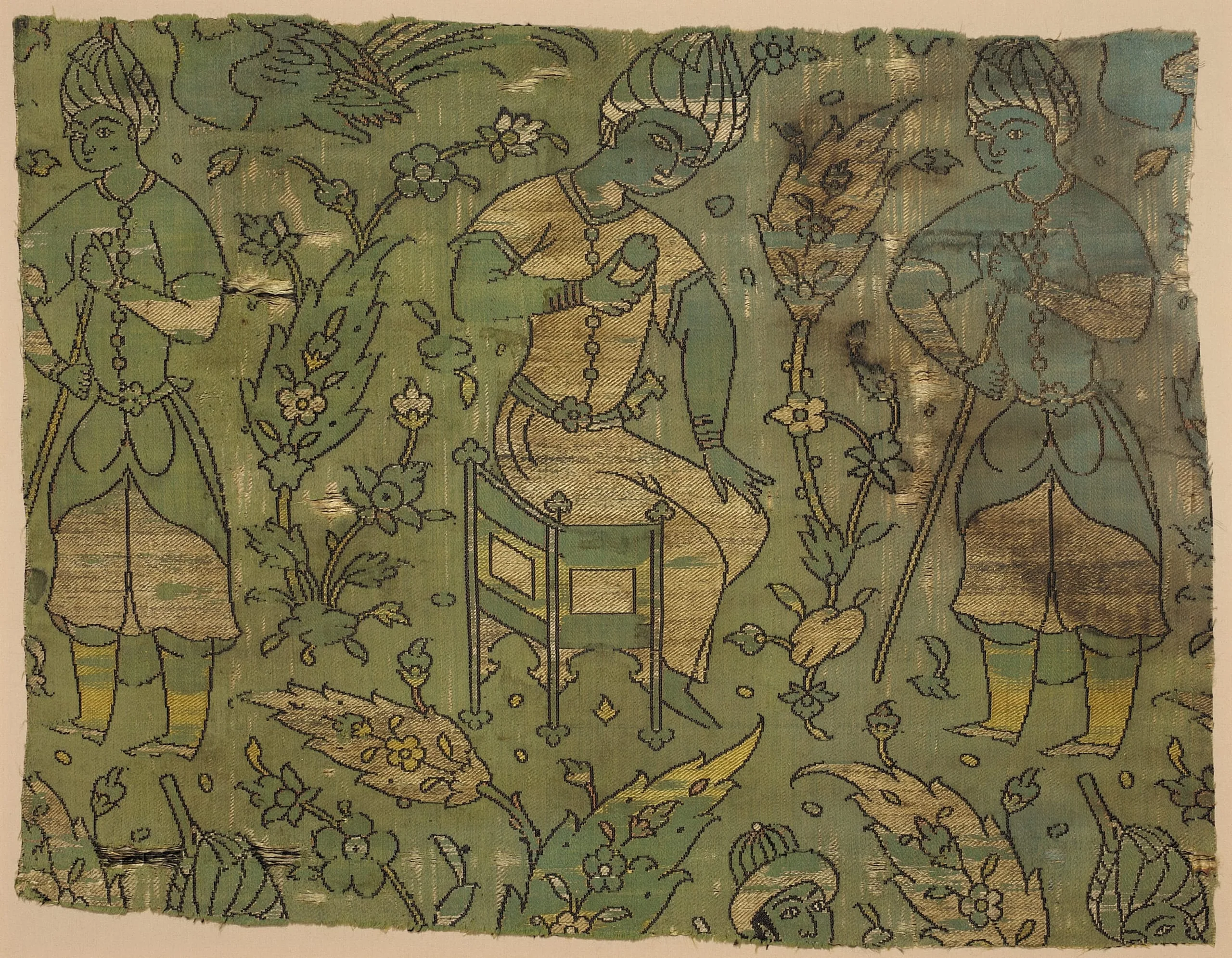 - Silk satin with silk and metallic-thread supplementary weft patterning bound in twill (lampas)