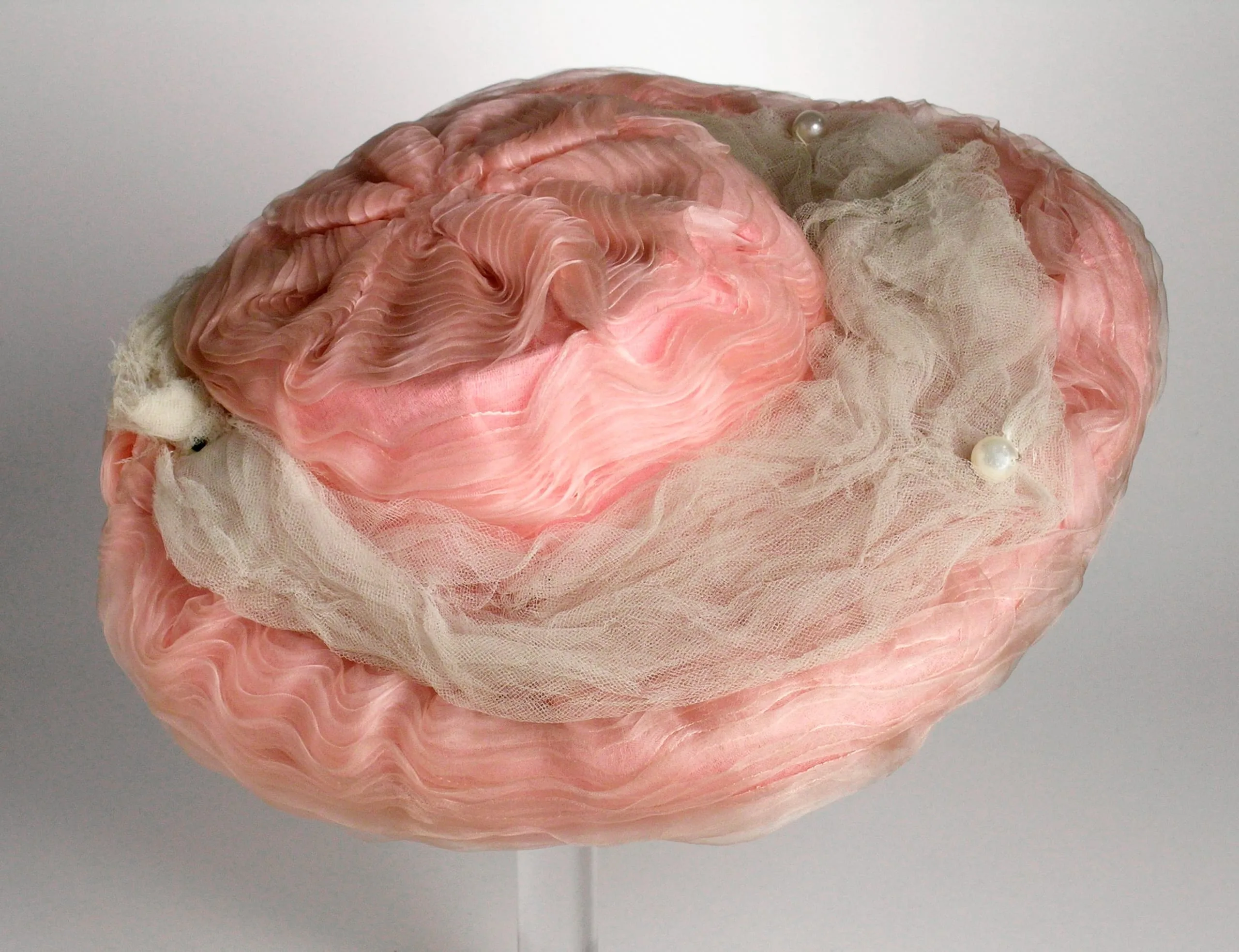 Wide-brimmed women's hat in ruffled blush pink ribbed fabric with ivory tulle netting and pearl accents, displayed on a white stand