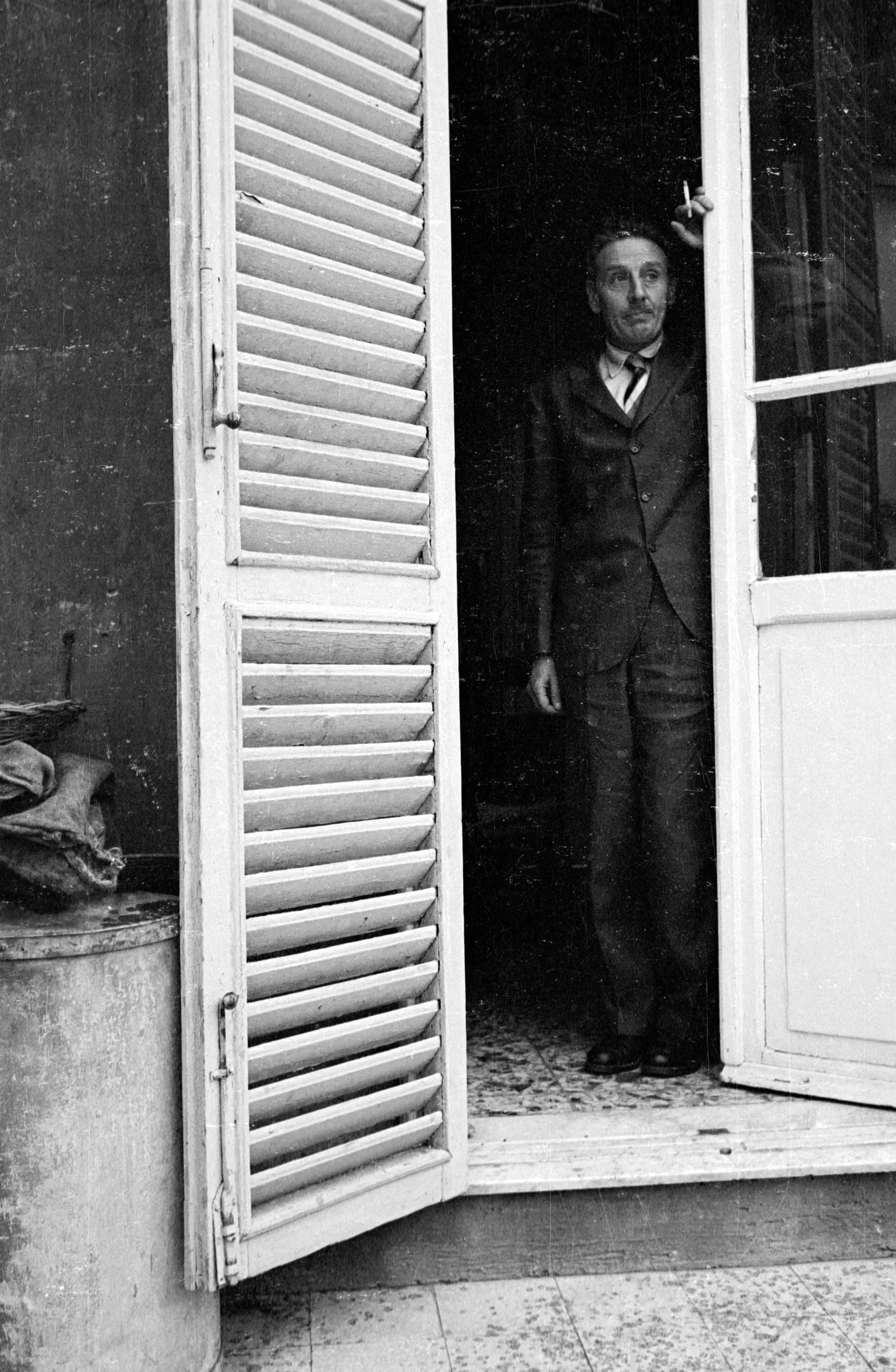Black and white photograph of a thin man in a dark suit standing in a doorway between louvered shutters, right arm raised holding a cigarette