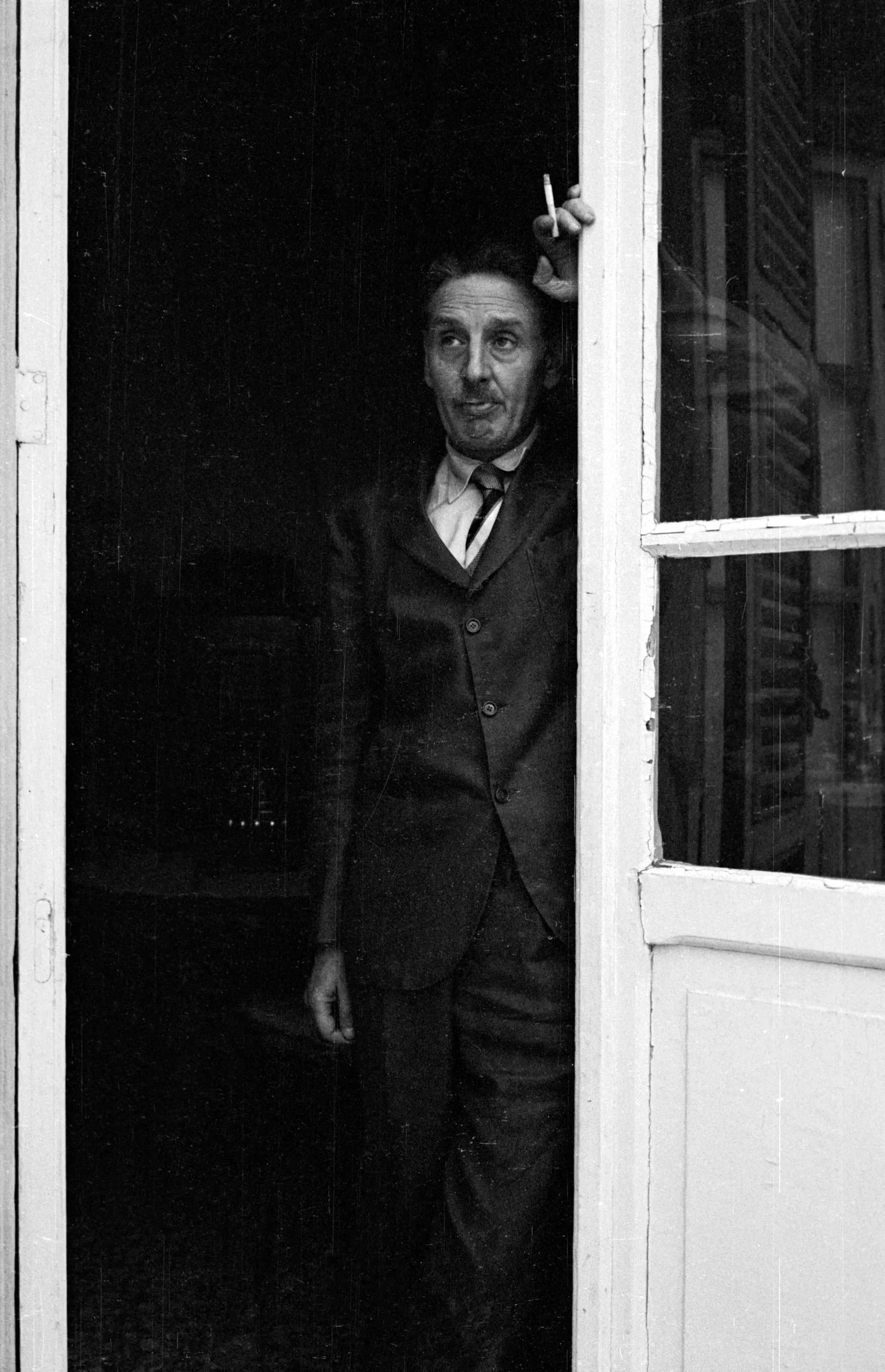 Black and white photograph of a white man in a rumpled dark suit standing in an open doorway, holding a cigarette above his head, looking up and to the left