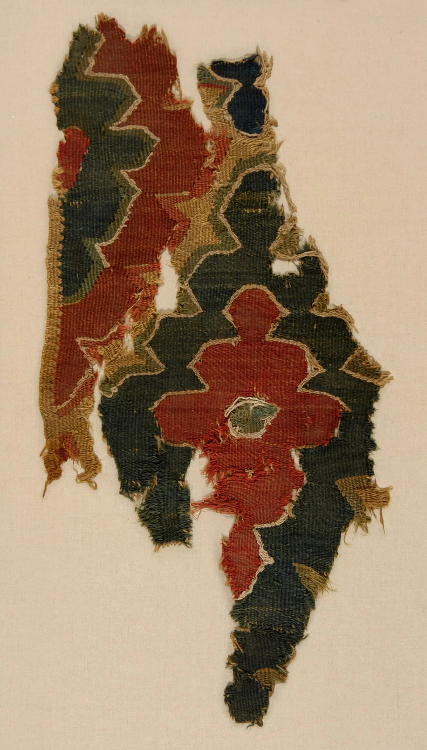 Textile fragment with tapestry weave in brick red, forest green, and navy, featuring geometric floral rosette motifs with frayed, irregular edges