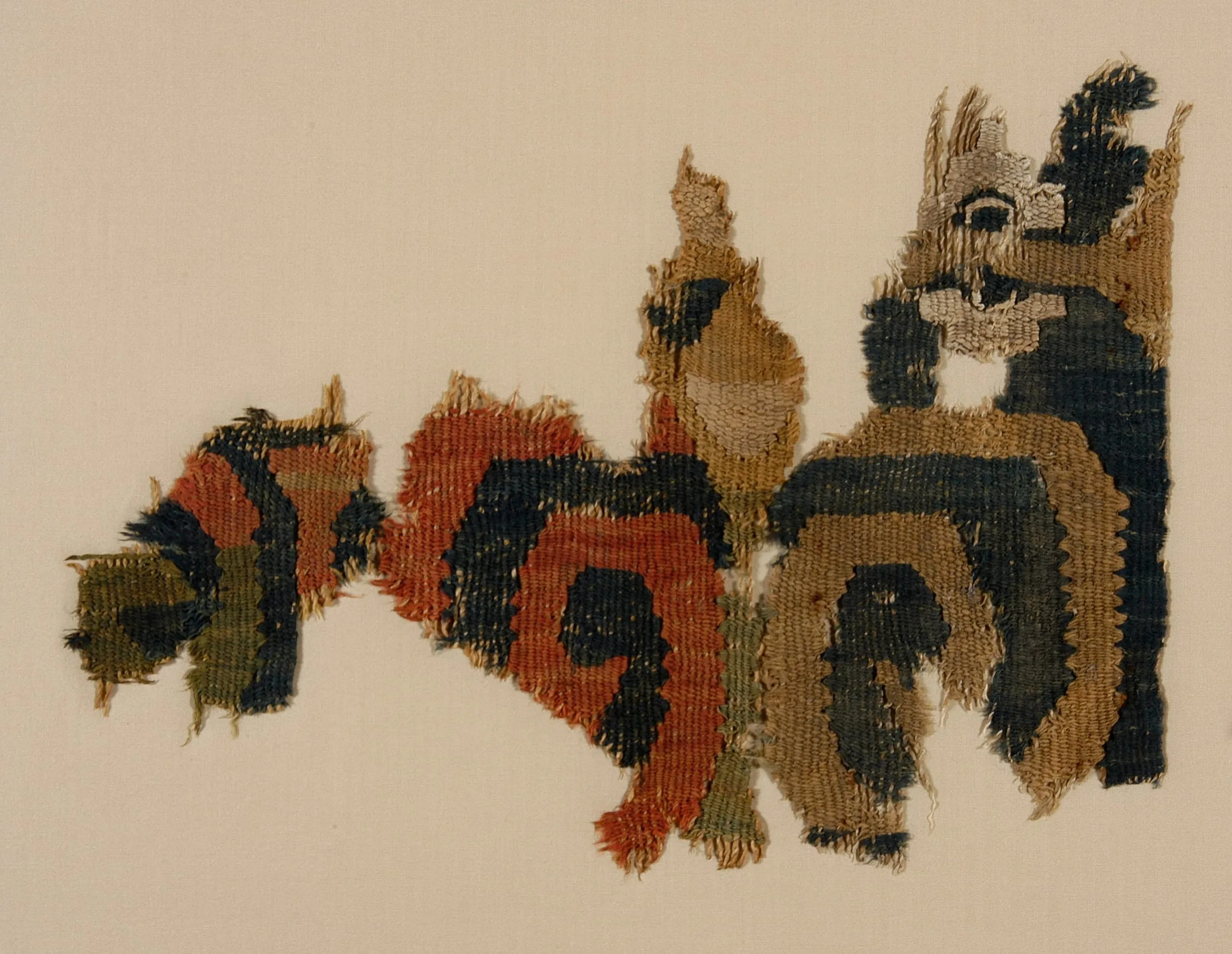 Fragmentary tapestry-woven textile with ragged edges, depicting stylized animal or figural forms in brick red, navy blue, olive green, and tan