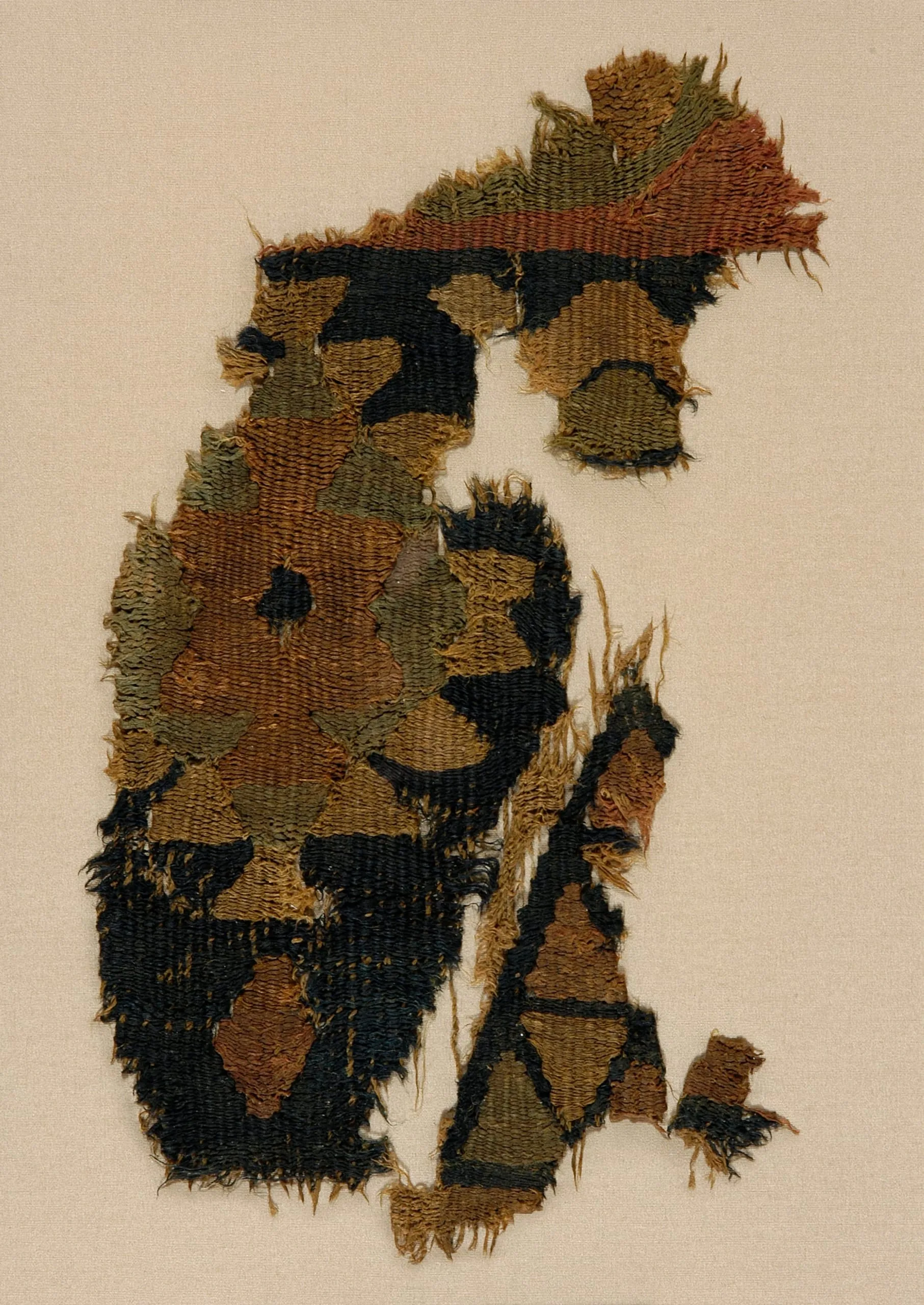 Fragmentary woven textile with bold geometric pattern in black, rust-brown, and olive green, with frayed edges showing significant deterioration