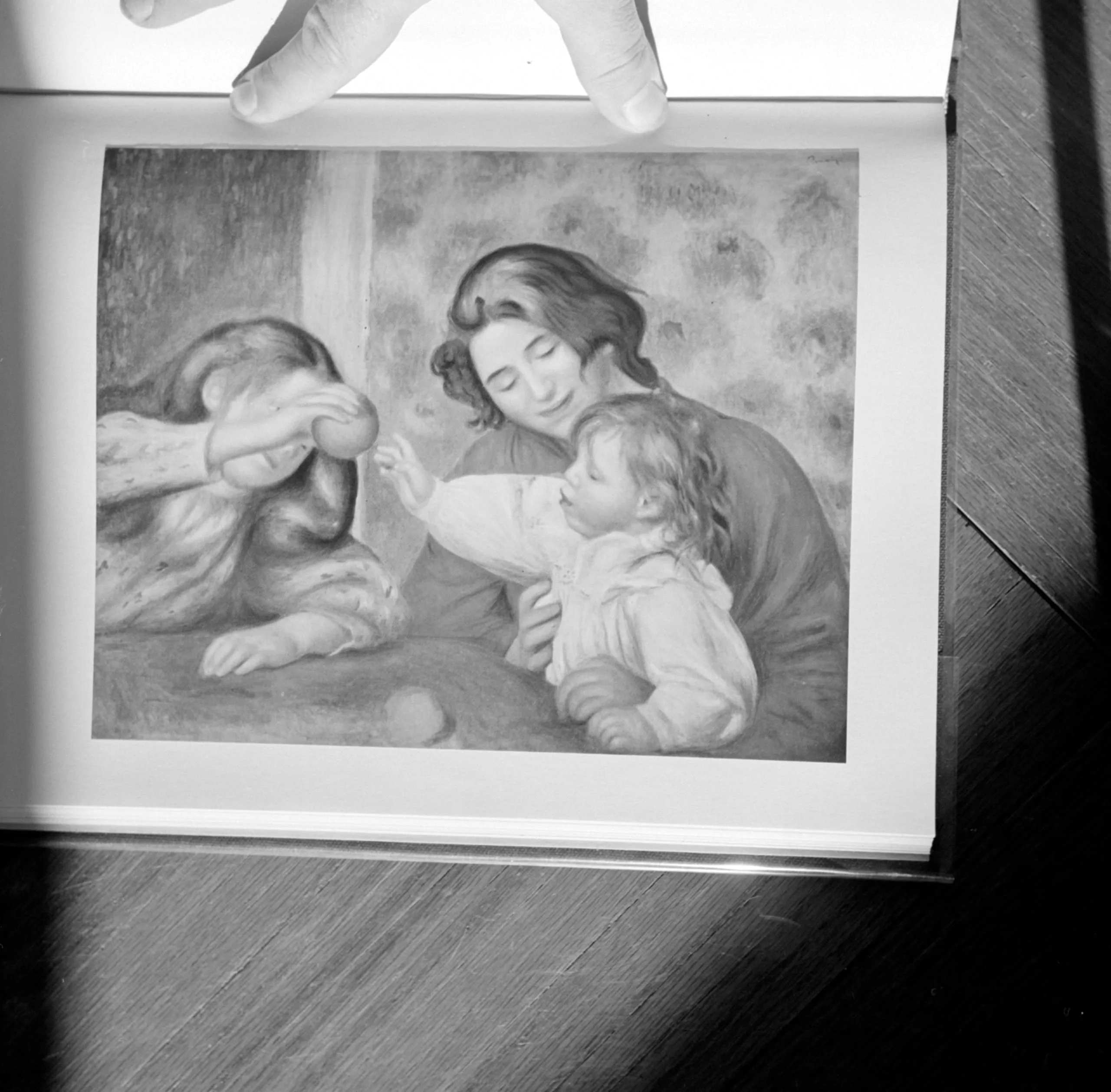 Black and white photograph of an open book showing a painting reproduction of a woman offering fruit to a young child, with a third figure bowed to the left