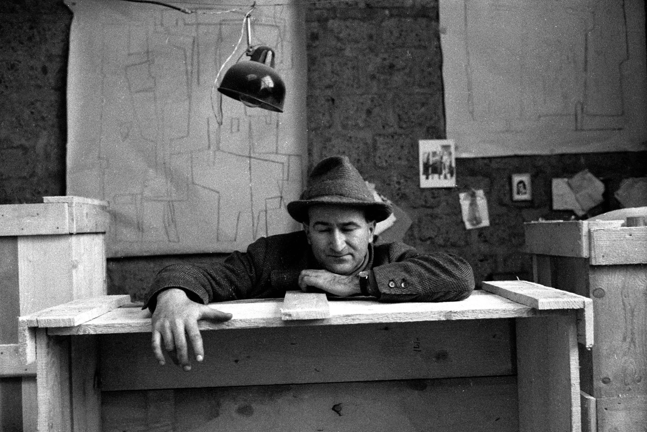 Black and white photograph of a man in a felt hat leaning chin-on-hands over a raw wooden crate in a studio, with large abstract drawings pinned to a stone wall behind him