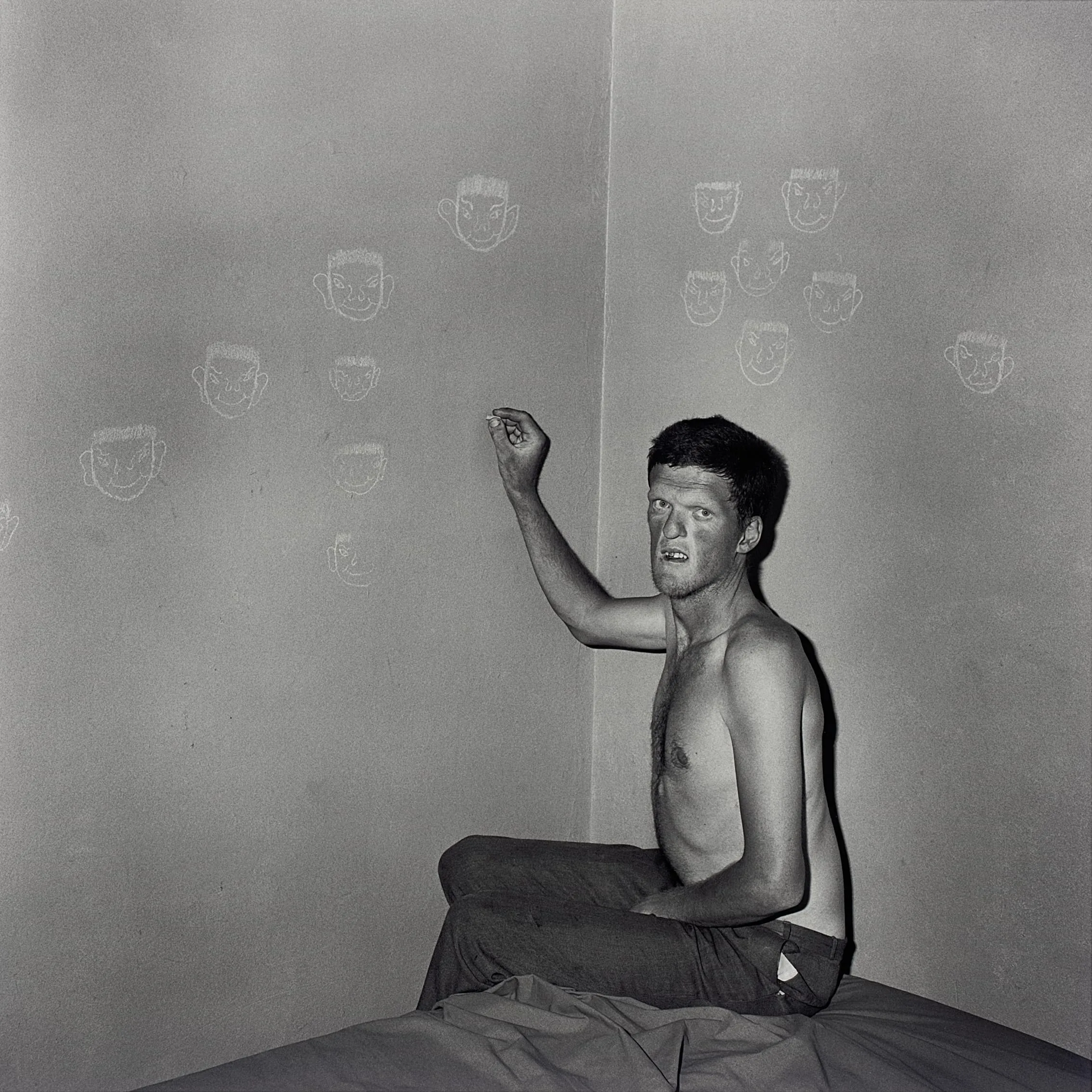 - Man drawing chalk faces on wall