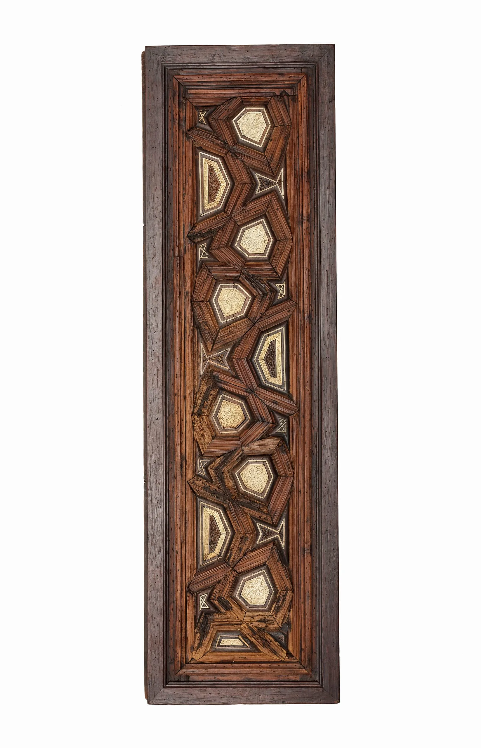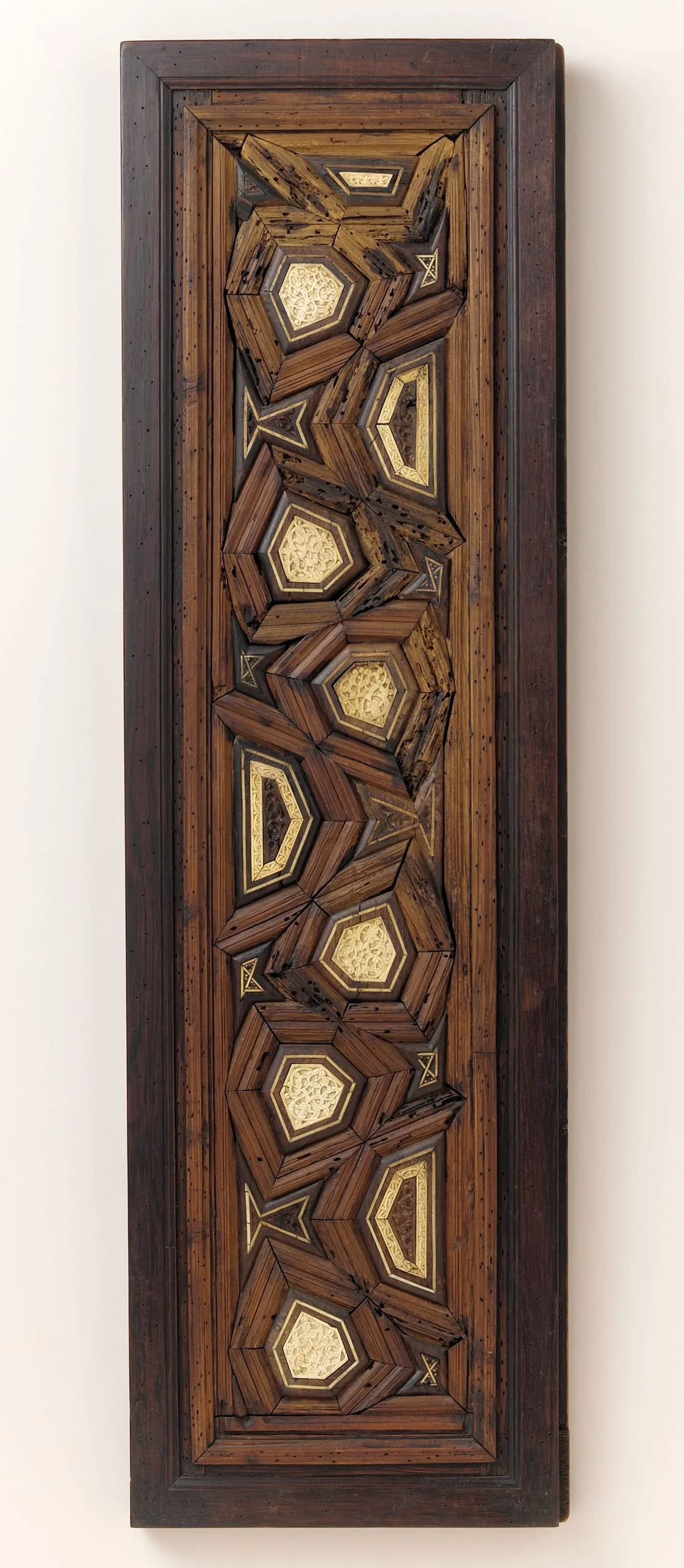 Ivory inlays were frequently combined with wood in the production of furniture and architectural fittings in late medieval Egypt. This elaborate method of fabrication, which used costly ivory and rare woods like ebony, required that individual elements, often of minute size, be cut, carved with intricate motifs, and then carefully assembled like a mosaic to form a larger unit of generally geometric design. It is difficult to say exactly how the present door functioned, but most likely it was one of a pair, perhaps for a cupboard set into the wall, in either a religious or a secular building.