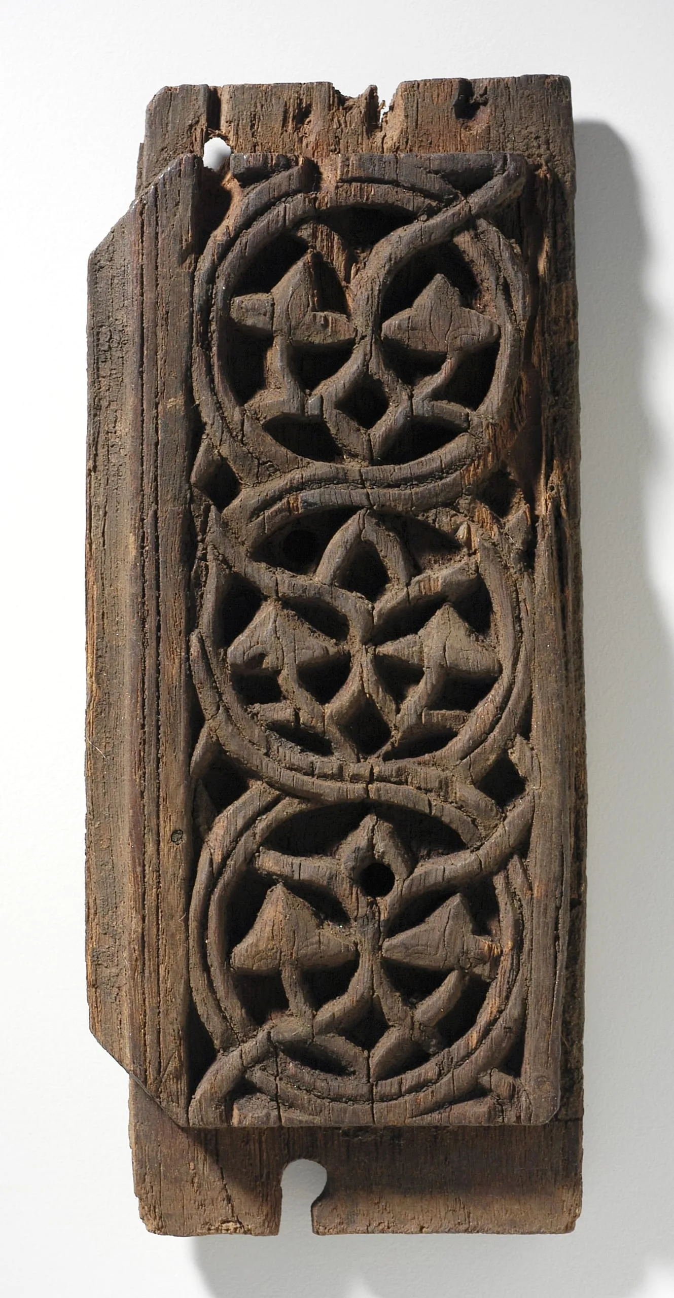 Carved wooden panel with openwork design of three vertically stacked interlocking circles, each containing a six-petaled rosette, in dark weathered wood